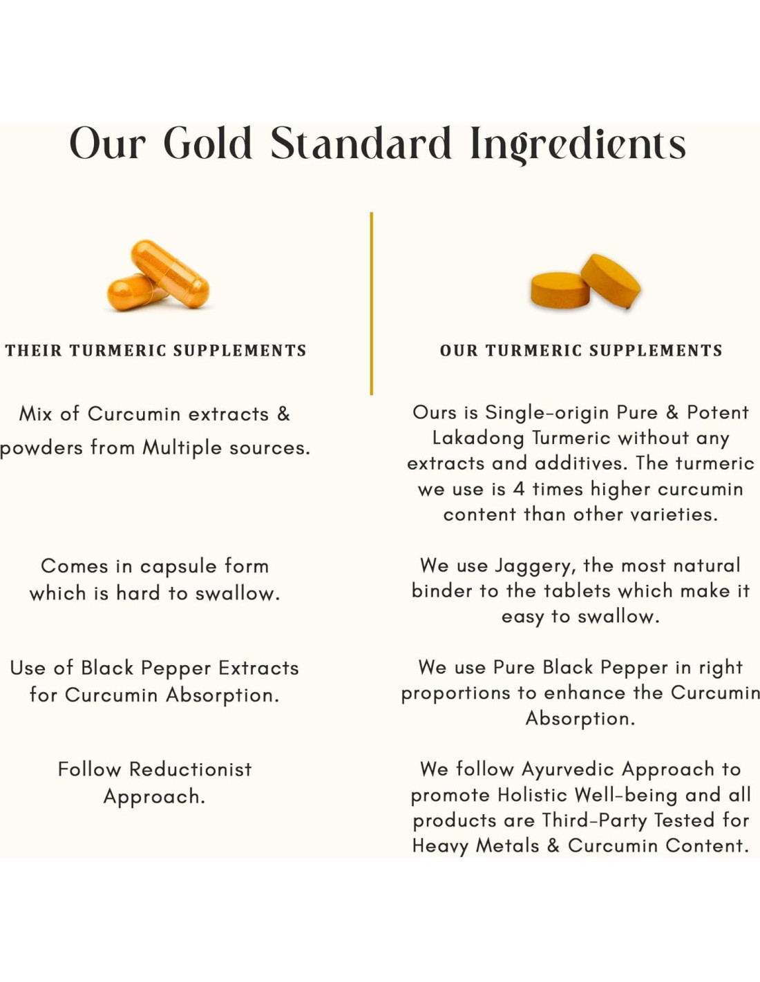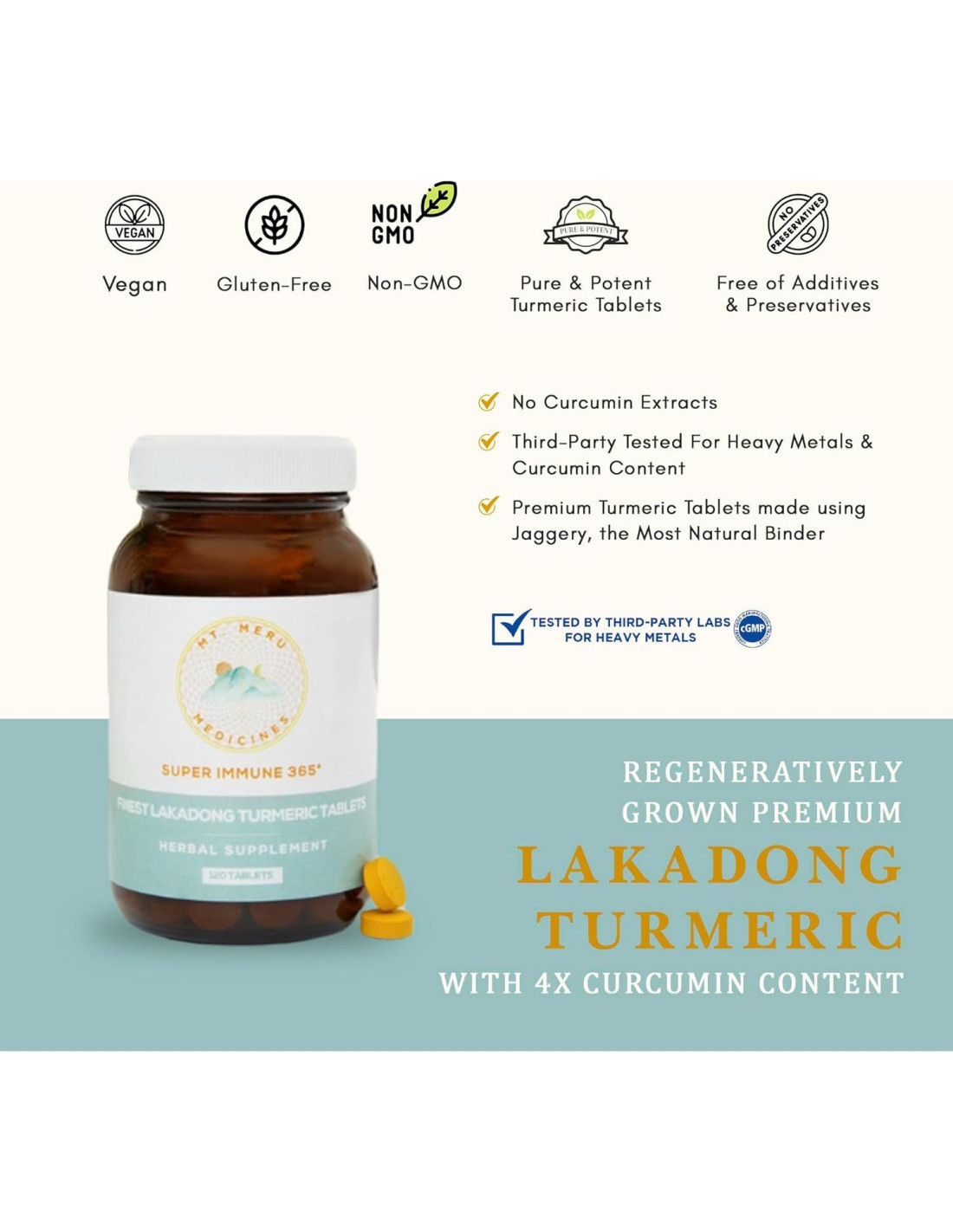 - Probado por Terceros: Los Suplementos de Cúrcuma Lakadong son probados por terceros para metales pesados como Plomo y Contenido de Curcumina y cumplen con las pautas CGMP
