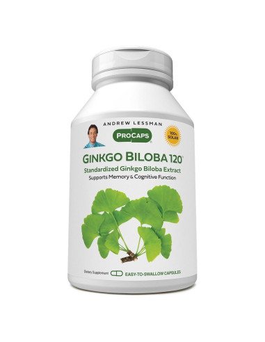 El Ginkgo Biloba 120 de Andrew Lessman proporciona ginkgo biloba concentrado en los niveles estandarizados utilizados en la investigación clínica. El ginkgo es, con mucho, el ingrediente botánico más investigado para la memoria y la función cerebral, pero sus beneficios requieren un extracto estandarizado y confiable, que es muy difícil de encontrar. Notablemente, el árbol de ginkgo biloba ha sobrevivido más de 200 millones de años y es una de las especies de árboles vivos más antiguas del mundo. El ginkgo se ha utilizado en la Medicina Tradicional China durante más de 5,000 años y ahora, la ciencia moderna ha documentado la capacidad del ginkgo para ayudar a mantener un flujo sanguíneo saludable al cerebro, lo cual es esencial para la entrega de oxígeno y nutrientes que alimentan la función cerebral. Numerosos estudios clínicos han atestiguado el papel del ginkgo en ayudar a combatir los cambios normales relacionados con la edad en la memoria y la función mental. Nuestro Ginkgo Biloba 120 ofrece el difícil de encontrar 'estándar clínico' de ginkgo, proporcionando los niveles de compuestos activos de ginkgo establecidos por la investigación: flavonoides-glicósidos (24%) y lactonas terpénicas (6%). Lamentablemente, la mayoría del ginkgo disponible no cumple con el estándar clínico, por lo que probamos diligentemente todo el ginkgo que utilizamos. Cada cápsula fácil de tragar también contiene un complejo de vitamina B de alta potencia para asegurar los mayores beneficios de nuestro Ginkgo Biloba 120.