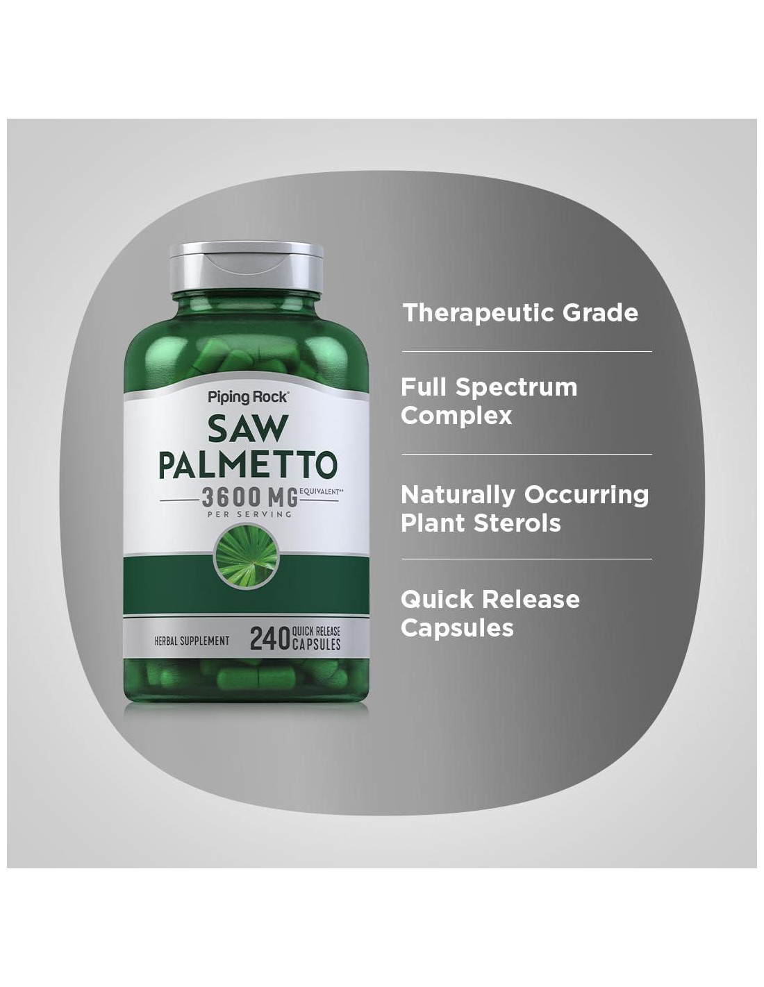 El Saw Palmetto es una pequeña palmera que es nativa de las partes del sur de EE. UU. El árbol de Saw Palmetto se utiliza comúnmente por sus hojas y bayas potentes. Aprovecha los beneficios del Saw Palmetto en formas como píldoras, cápsulas, tabletas, geles blandos, polvo a granel, gomitas, aceite esencial, multivitaminas, tinturas, extractos líquidos, cremas tópicas, sueros y otros suplementos herbales. El Saw Palmetto Piping Rock 3600 mg ofrece una porción potente de esta hierba tradicional en cápsulas de liberación rápida. ¡Consigue una botella hoy! Piping Rock ofrece con orgullo una selección en constante crecimiento de productos diseñados para ayudarte a alcanzar tus objetivos únicos de bienestar. Verificamos todos los productos con agencias registradas de terceros asegurando pureza, potencia, seguridad e innovación en todo lo que hacemos. Estamos comprometidos a apoyarte en tu camino hacia una vida saludable, ¡y te agradecemos por elegirnos!