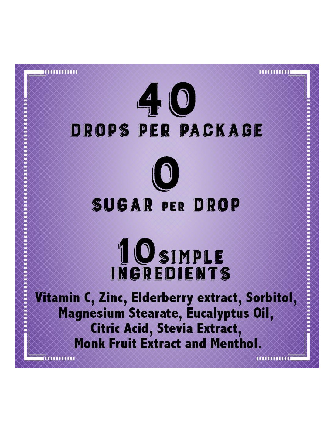 - Qué Hay en Nuestras Gotas: Vitamina C, Zinc, Extracto de Saúco, Sorbitol, Estearato de Magnesio, Sabores Naturales, Ácido Cítrico, Extracto de Stevia, Aceite de Eucalipto, Extracto de Fruta del Monje y Mentol.