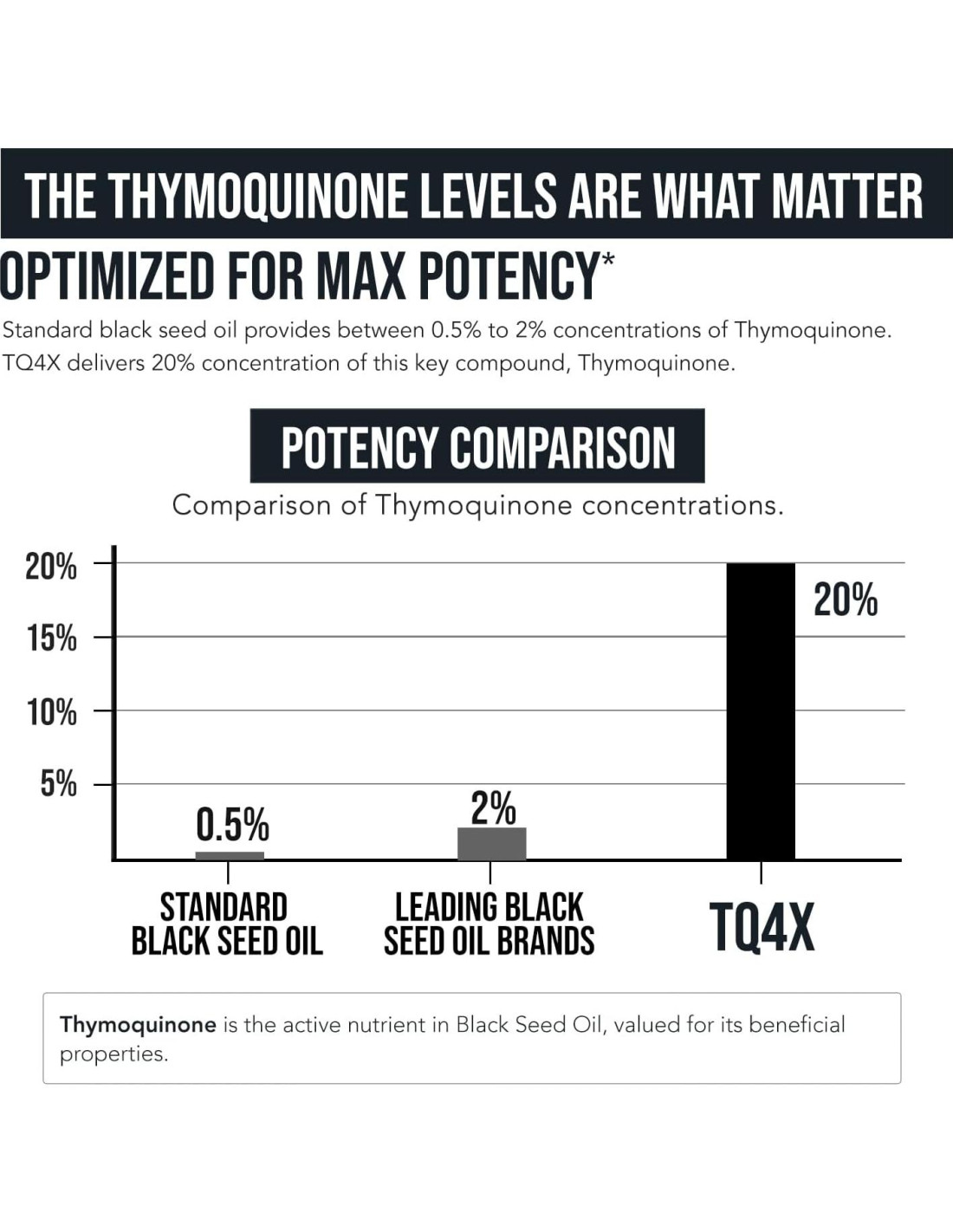 - Vegano, Probado por Terceros y Fabricación GMP: TQ-Advanced 4X es vegano, libre de OGM, libre de rellenos, libre de soya, libre de lácteos y libre de conservantes. Nuestras cápsulas de aceite de comino negro son probadas de manera independiente por más de 100 contaminantes y microbianos, y se fabrican en los EE. UU. en una instalación regulada por GMP.
