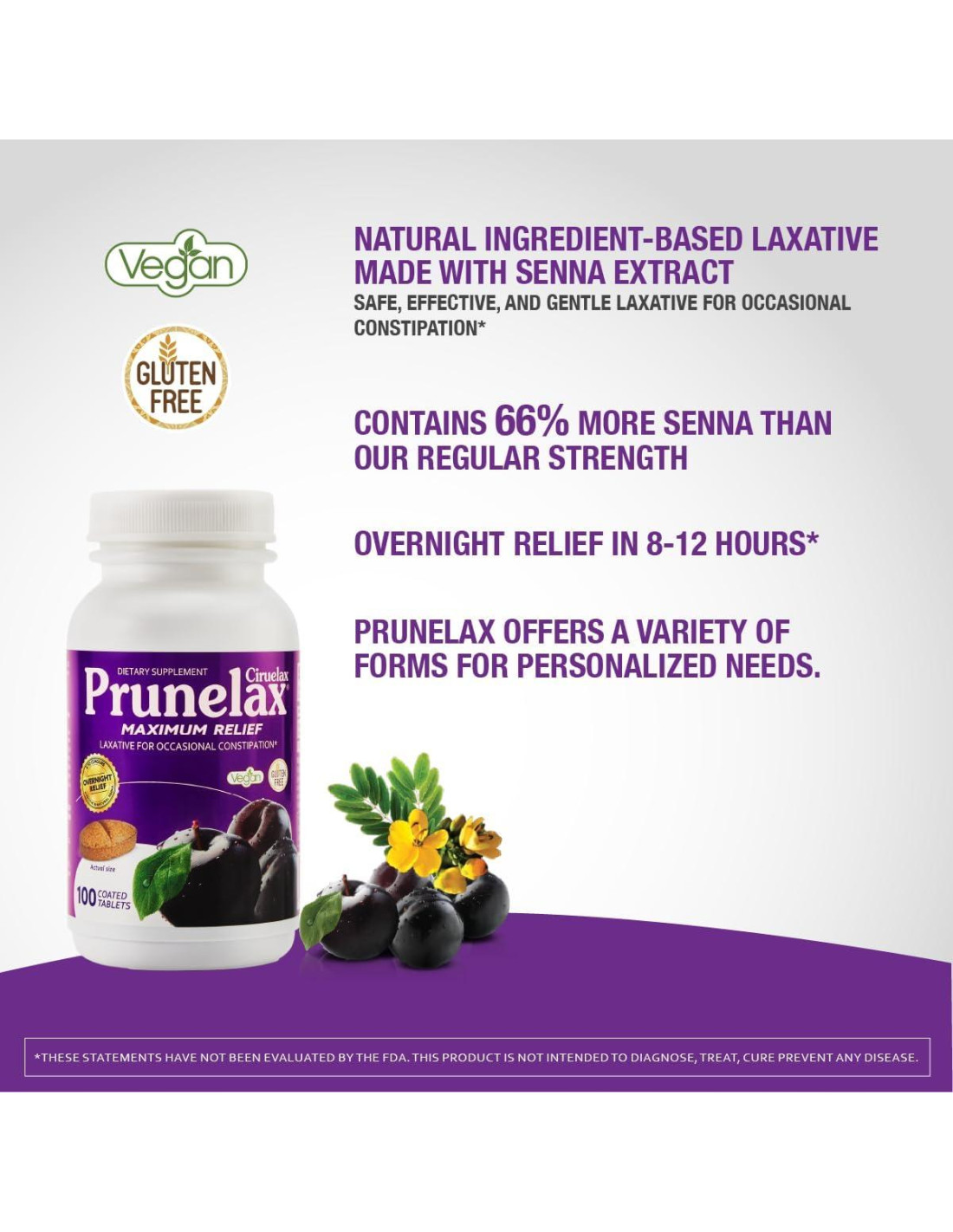 - Hecho con Senna Natural: Cada porción contiene 250mg de Extractos de Hoja de Senna, las tabletas Prunelax Máximo Alivio son 66% más fuertes que Prunelax de Fuerza Regular. Promoviendo un alivio seguro, efectivo y suave.