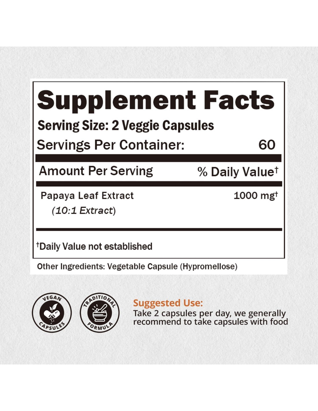 - Fórmula de Alta Potencia y Fácil Consumo: Cada porción consiste en 2 cápsulas, proporcionando 1000mg de extracto de hoja de papaya altamente concentrado, logrado a través de un proceso de ultra concentración 10:1, equivalente a la esencia de 10,000mg de hojas frescas. Solo 2 cápsulas al día, y con 120 cápsulas veganas a base de plantas en una botella, proporciona un suministro de 60 días para una rutina de salud conveniente y consistente.