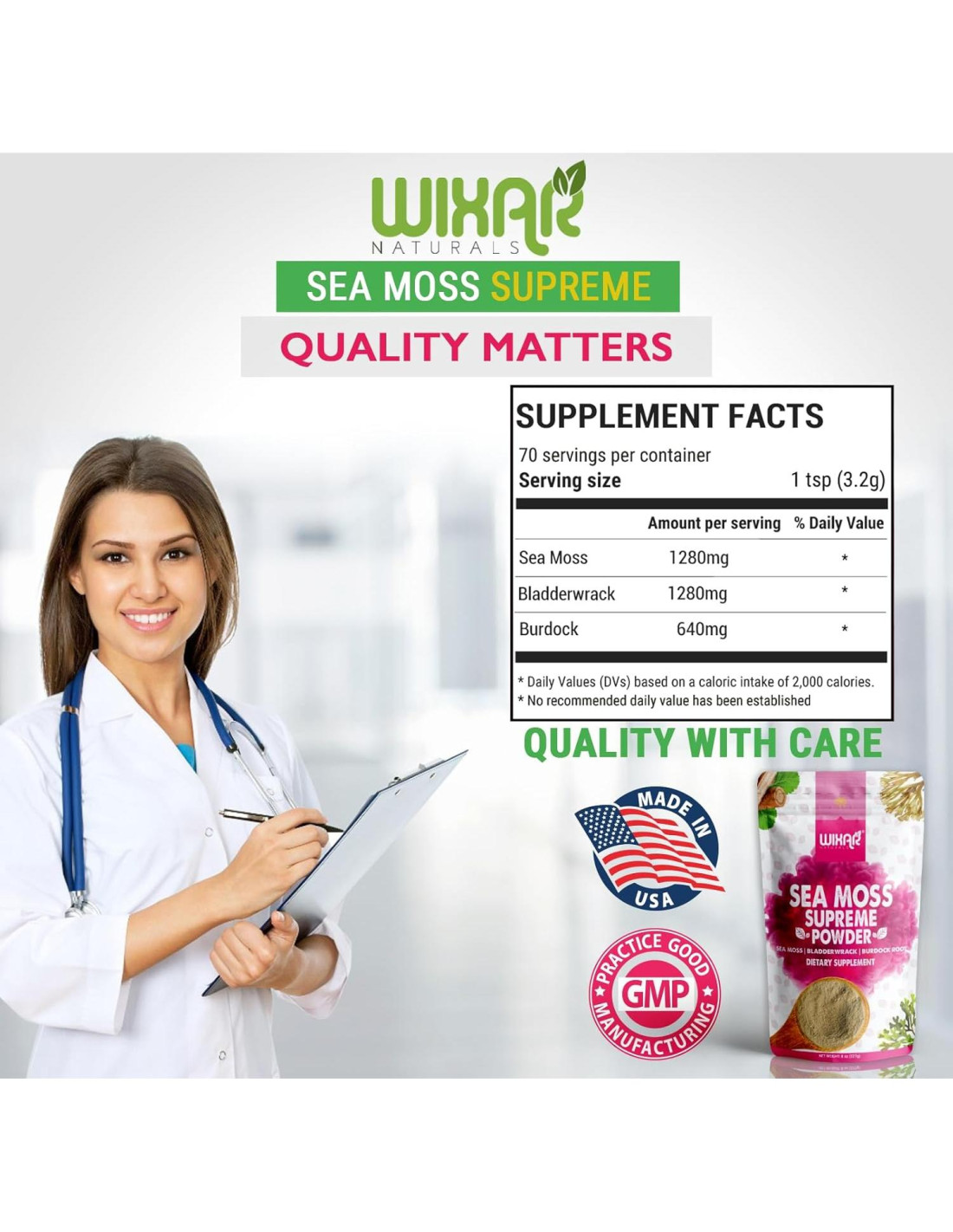 - [ POLVO DE MUSGO MARINO SUPREMO ] - Nuestra Fórmula Suprema de Musgo Marino Wixar Naturals está formulada sin ningún tipo de basura. (Sin rellenos, químicos, conservantes, tintes, etc). Nuestro polvo de Musgo Marino Supremo Wixar Naturals contiene 1280 mg de Musgo Marino Irlandés, 1280 mg de Algas Fucus y 640 mg de raíz de Bardana por porción para ayudar a proporcionar 102 vitaminas y minerales que el cuerpo necesita para mantener un estilo de vida saludable.