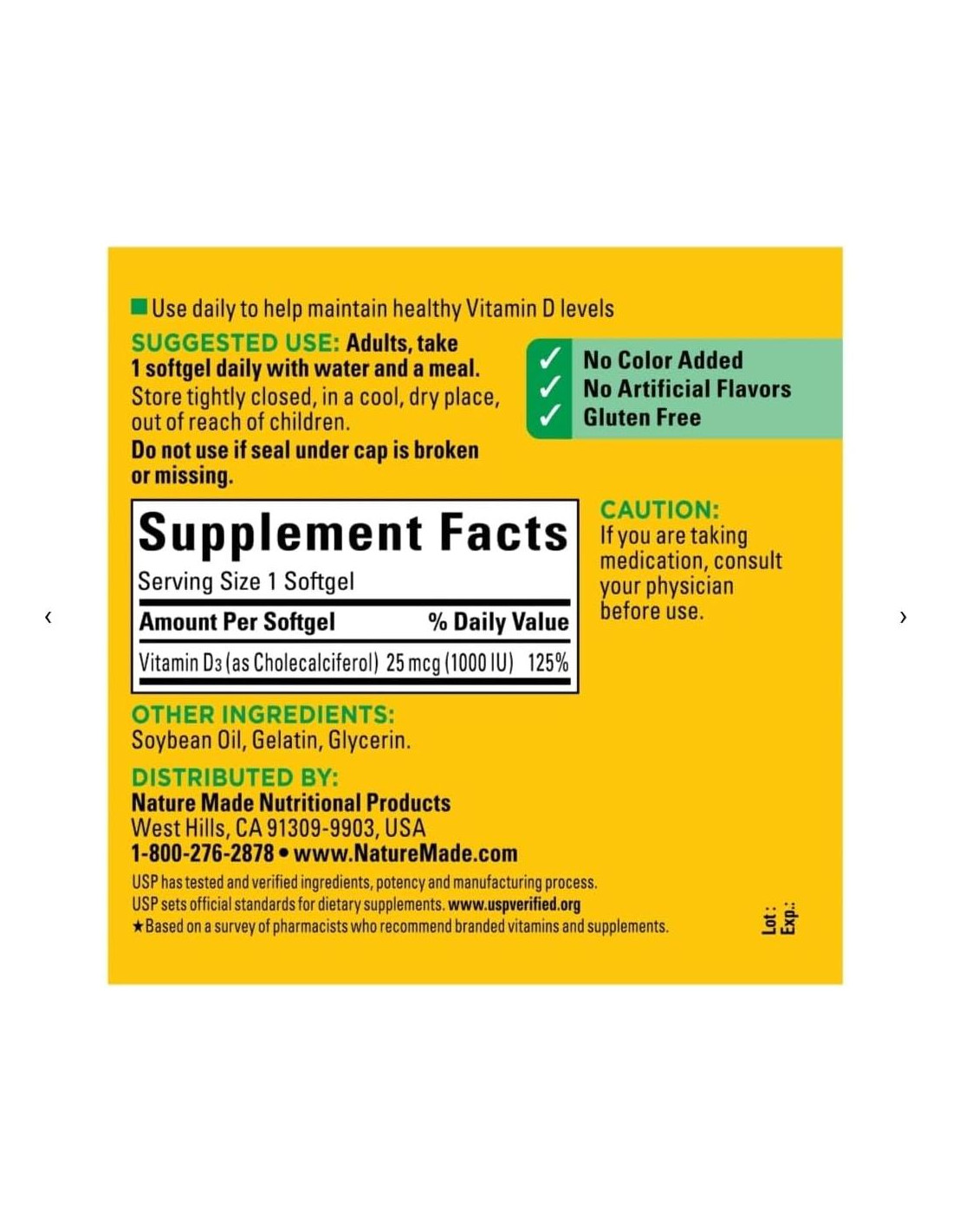 - VERIFICADO POR USP: Debido a que Nature Made está comprometido con la calidad y pureza, este suplemento de Vitamina D también está Verificado por USP, una organización independiente que prueba la calidad y pureza.