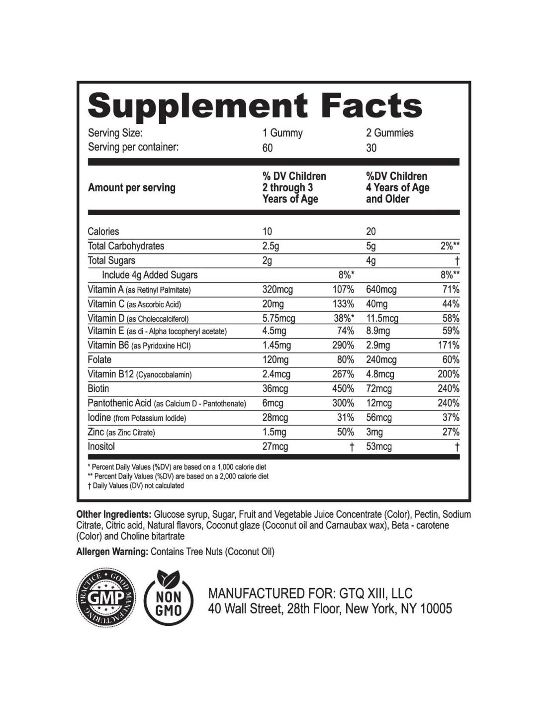 - 14 nutrientes esenciales (incluyendo vitamina A, B6, B12, C, D3, E, Zinc, Ácido Fólico, Biotina y más) en deliciosas gominolas multivitamínicas para niños