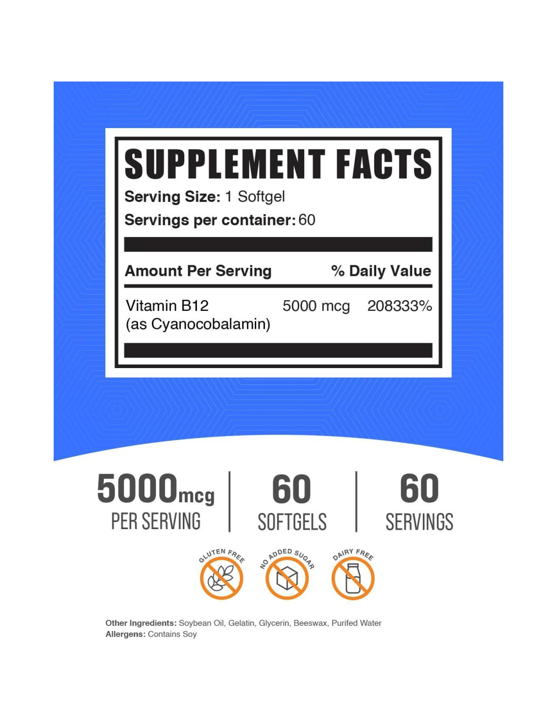- Soporte Nutricional Fácil de Integrar: Nuestros softgels de B12 5000mcg, en forma de Cianocobalamina, están diseñados pensando en tu conveniencia, ofreciendo softgels fáciles de tragar que pueden convertirse sin problemas en parte de tu régimen de salud existente. Mejora tu ingesta nutricional tomando la dosis recomendada junto con tu primera comida del día.