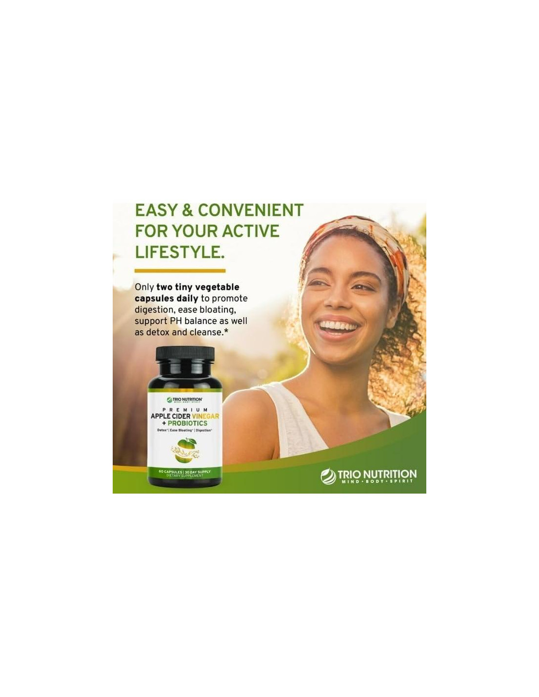 - Di Adiós a la Hinchazón de Forma Natural: El Vinagre de Sidra de Manzana de Trio Nutrition con Miles de Probióticos de Múltiples Cepas es una excelente manera de apoyar tu salud digestiva. Ayudan a reducir la hinchazón, promover un metabolismo saludable, mantener el equilibrio del pH y ayudar con el manejo del peso. Las Cápsulas de ACV son una forma fácil de mantener la salud de tu intestino bajo control y sentirte bien todos los días.