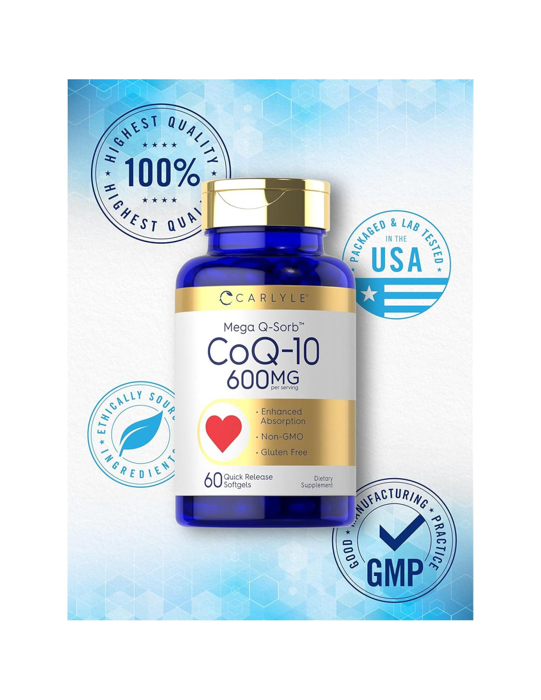 En Carlyle, nuestras raíces son profundas con más de 40 años de experiencia en salud y bienestar. Tres generaciones después, nuestra familia está comprometida a proporcionar productos de calidad en los que puedes confiar. Nuestra experiencia en la obtención de los ingredientes más puros combinada con tecnologías avanzadas nos enorgullece ofrecer suplementos premium y honestos al mejor valor. Estamos dedicados a apoyarte y gracias por elegirnos en tu búsqueda de una vida saludable. Ingredientes de confianza y calidad superior. Nuestras raíces en la industria de suplementos comenzaron en 1971, con solo un padre y un hijo. Tres generaciones y tres negocios exitosos después, te traemos Carlyle. Nuestra empresa se basa en la experiencia, el trabajo duro y el crecimiento. Contamos con un equipo dedicado que aporta más de 40 años de experiencia en la creación de vitaminas, minerales y suplementos herbales. No es suficiente para nosotros proporcionarte suplementos de alta calidad a bajo costo, queremos apuntar más alto. Queremos ofrecerte la mejor experiencia posible. Comúnmente conocido como el antioxidante universal, la Coenzima Q10 es un compuesto importante que se encuentra en todo el cuerpo. Con el tiempo, se vuelve más difícil para tu cuerpo producir este nutriente. La CoQ10 ahora se puede obtener de alimentos nutritivos en cantidades traza y también puede provenir de un suplemento como líquido, polvo a granel, tabletas, gomitas, cápsulas y masticables. Esta fórmula de alta potencia presenta 600 mg por porción de Mega Q-Sorb, una forma altamente innovadora de CoQ10, en gelatinas blandas de liberación rápida y sin OGM. Nuestras fórmulas son cuidadosamente probadas por calidad para pureza y potencia, porque mereces nada menos que las mejores vitaminas cuando se trata de tu salud y bienestar. Nuestra experiencia en la obtención de los ingredientes más puros combinada con tecnologías avanzadas nos enorgullece ofrecer suplementos premium y honestos al mejor valor. Carlyle Mega Q-Sorb es un testimonio de nuestro compromiso con la excelencia, hecho con ingredientes poderosos arraigados en el bienestar. Gracias por elegirnos en tu búsqueda de vivir saludablemente. ADVERTENCIA: Si estás embarazada, amamantando, tomando algún medicamento o tienes alguna condición médica, consulta a tu médico antes de usar. Si ocurren reacciones adversas, deja de usar este producto inmediatamente y consulta a tu médico. Si el sello debajo de la tapa está dañado o falta, no lo uses. Mantener fuera del alcance de los niños. Almacenar en un lugar fresco y seco.