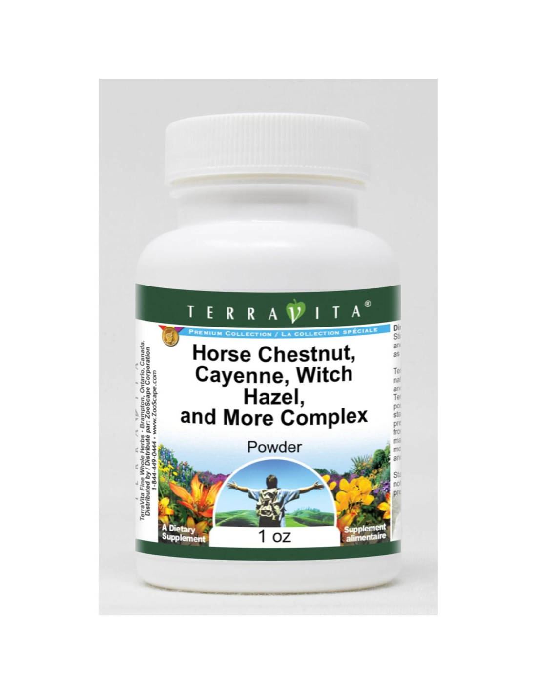 Castaño de Indias, Cayena, Hamamelis y Más Polvo Complejo (28.35 g, ZIN: 517075) Empacado en los Estados Unidos en una instalación certificada GMP (Buenas Prácticas de Manufactura). Sin rellenos. Fabricante: TerraVita Tamaño: 28.35 g Formato de polvo conveniente. Ingredientes: Cayena, Castaño de Indias, Roble Blanco, Hamamelis