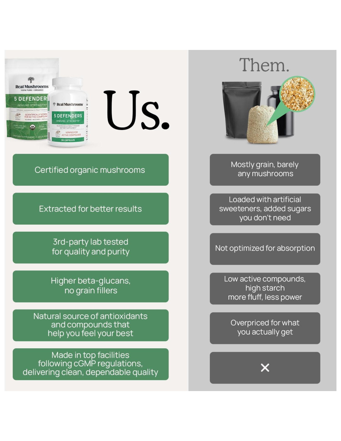 - Hongos Hechos Reales: En Real Mushrooms, producimos suplementos de hongo orgánico que solo contienen 100% hongos orgánicos. Nuestro compromiso con la calidad en nuestros suplementos es atestiguado por nuestro meticuloso proceso de fabricación en los EE. UU.