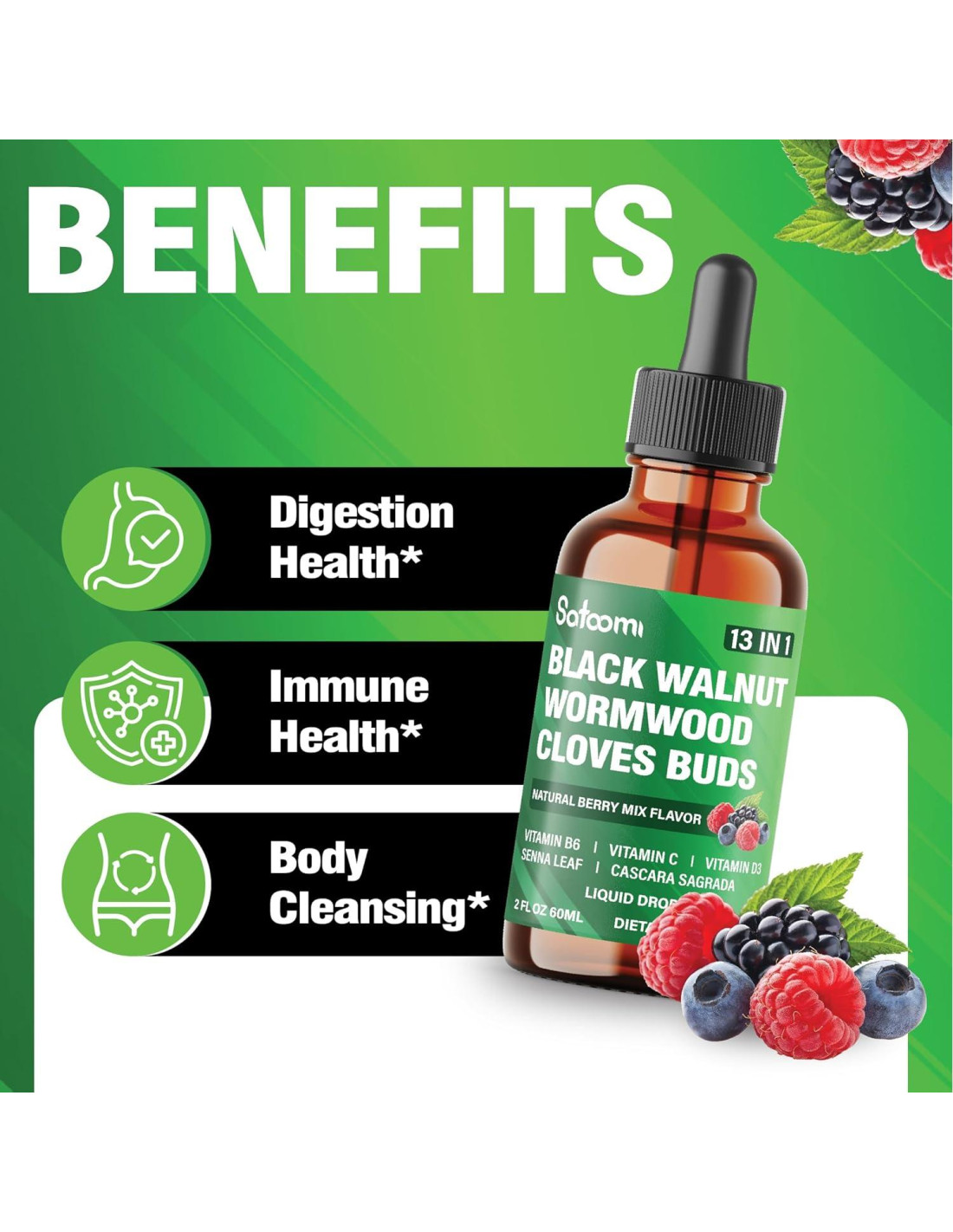- Ingredientes Clave: Las Gotas de Tinción de Nogal Negro incluyen Nogal Negro, Ajenjo, Botones de Clavo, Vitamina B6, Vitamina C, Vitamina D3, Hoja de Senna, Corteza de Cascara Sagrada, Cáscara de Psyllium, Semilla de Calabaza, Hongo Reishi, Hoja de Menta y Hojas de Graviola. 13 ingredientes apoyan la digestión, la salud inmunológica y la limpieza del cuerpo.