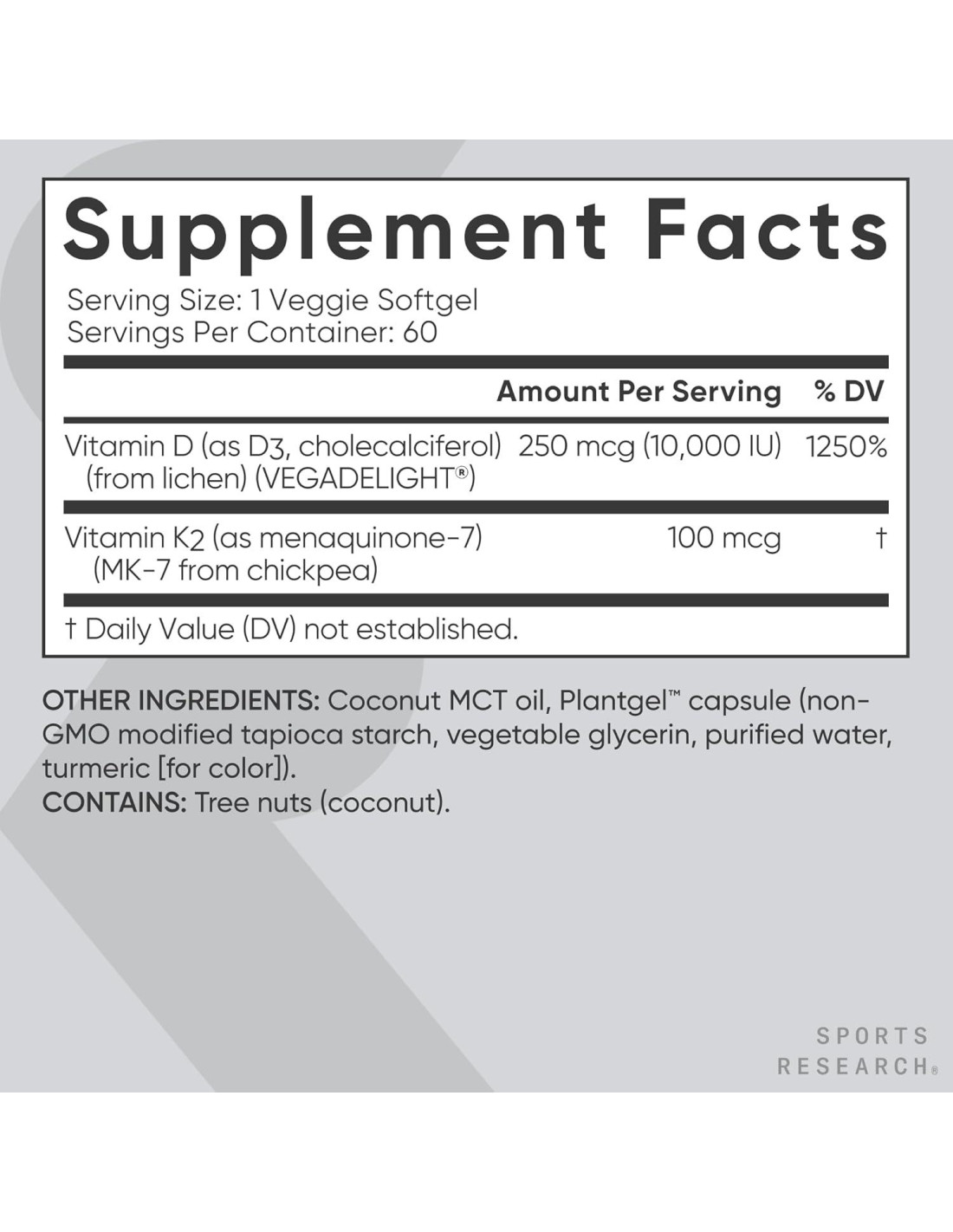 - FÓRMULA DE UNA AL DÍA: Obtén lo mejor de ambos mundos con Sports Research D3+K2. Solo una gelatina blanda de fácil de tragar proporciona 10,000iu de D3 Vegana y 100mcg de Vitamina K2 (como MK7, la forma de K2 con la mayor biodisponibilidad) para huesos más fuertes y apoyo al sistema inmunológico para que puedas brillar con más fuerza.*