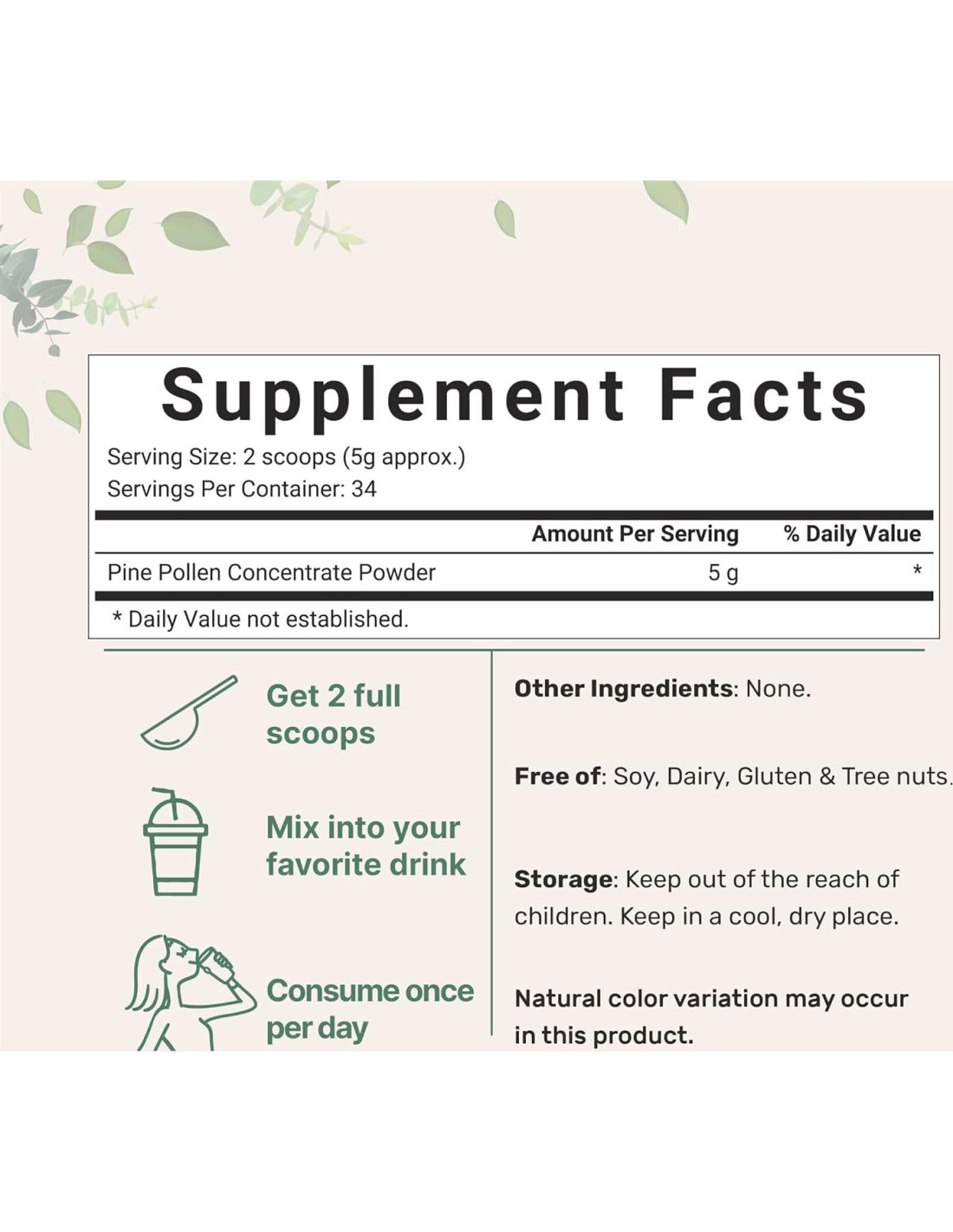 Nuestro ingrediente de polen de pino está hecho de la manera más natural posible, obteniendo solo polen de pino puro. Hicimos este producto un concentrado para brindarte una potencia más fresca y duradera en cada porción. Dejándote con todo el poder de esta solución herbal natural y sin aditivos ni conservantes adicionales.