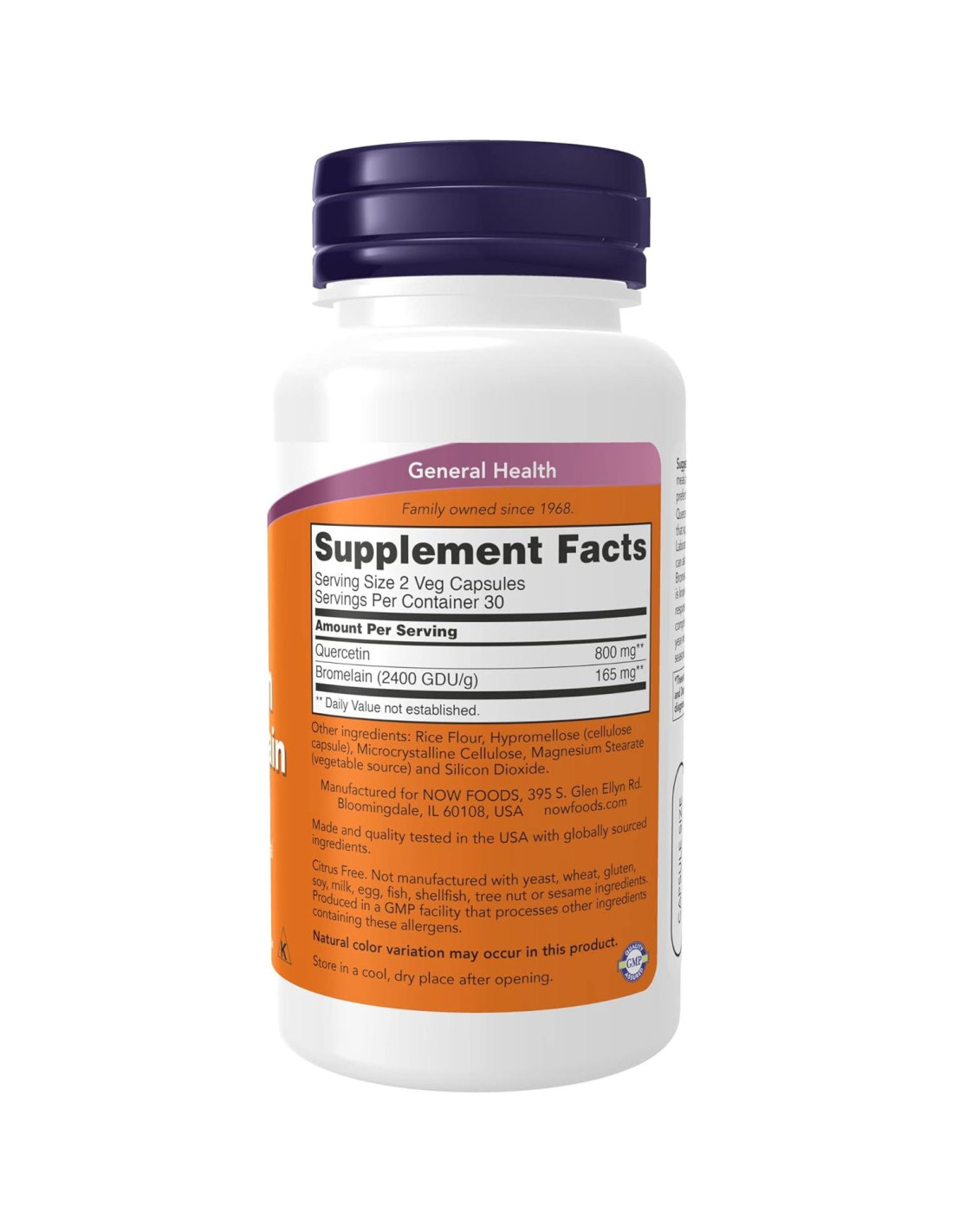 La quercetina es un captador de radicales libres que ocurre de forma natural y que apoya la función saludable del sistema inmunológico estacional.* Estudios de laboratorio han demostrado que la quercetina también puede ayudar a promover la función respiratoria normal.* La bromelina tiene una larga historia de uso por parte de herbolarios y se conoce por ayudar a apoyar una respuesta equilibrada del sistema inmunológico a los desafíos ambientales.* Esta combinación complementaria puede, por lo tanto, promover la salud respiratoria durante todo el año y apoyar el confort estacional general.* Tome 2 cápsulas 20 minutos antes de las comidas, dos veces al día. Las personas con estómagos sensibles pueden preferir tomar las cápsulas con comida.