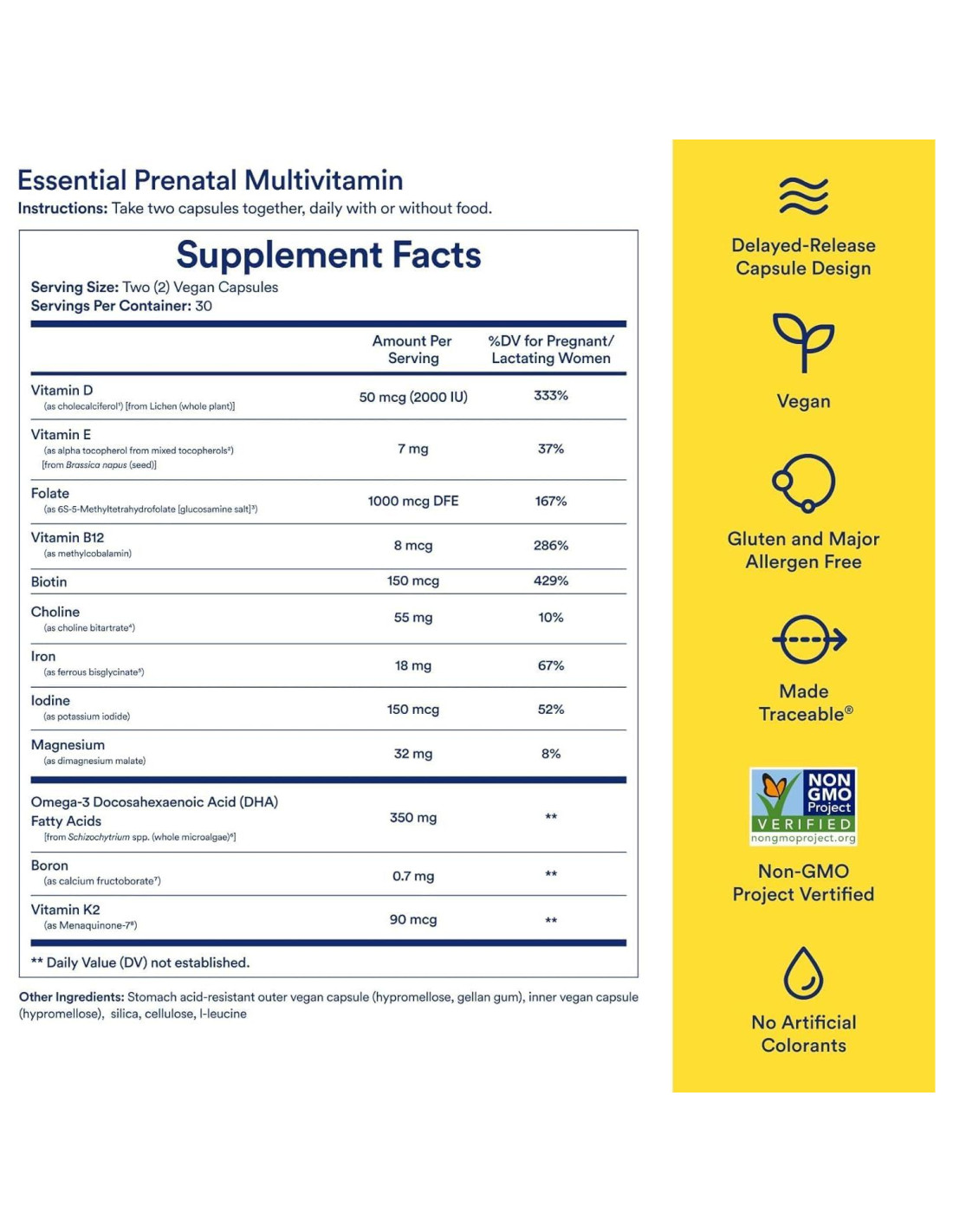 - HECHO TRAZABLE: Nuestros científicos de clase mundial buscaron en todo el mundo ingredientes de alta calidad al formular el Multivitamínico Prenatal Esencial para Mujeres. Nuestra fórmula incluye folato activo y metilado de Italia - para soporte cerebral, Omega-3 DHA de microalgas descubiertas en Nueva Escocia - para soporte cardíaco, colina de Missouri, hecha con ácido tartárico idéntico a la naturaleza - para soporte cerebral, y hierro quelado suave respaldado por décadas de estudios humanos, de Utah - para soporte de formación de sangre.*