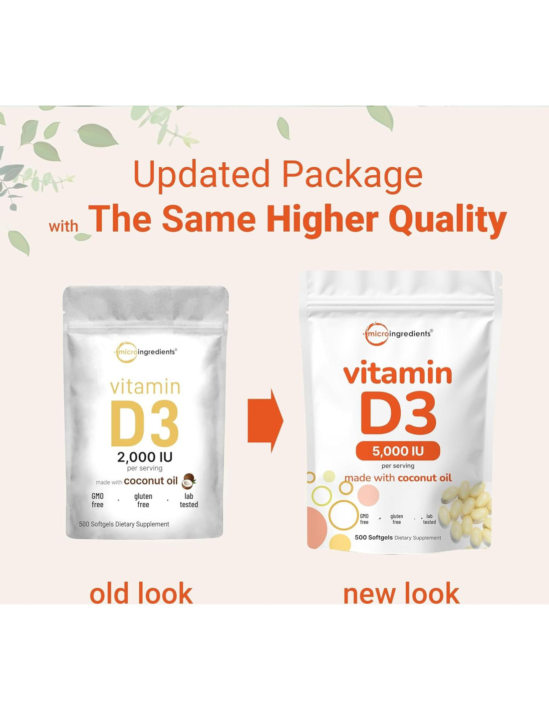 - Cada bolsa ofrece un suministro duradero de 500 gelatinas blandas mini infundidas con aceite de coco fáciles de consumir. Un tamaño de porción potente de una vez al día que proporciona 5,000 UI (125 mcg) de Vitamina D3.