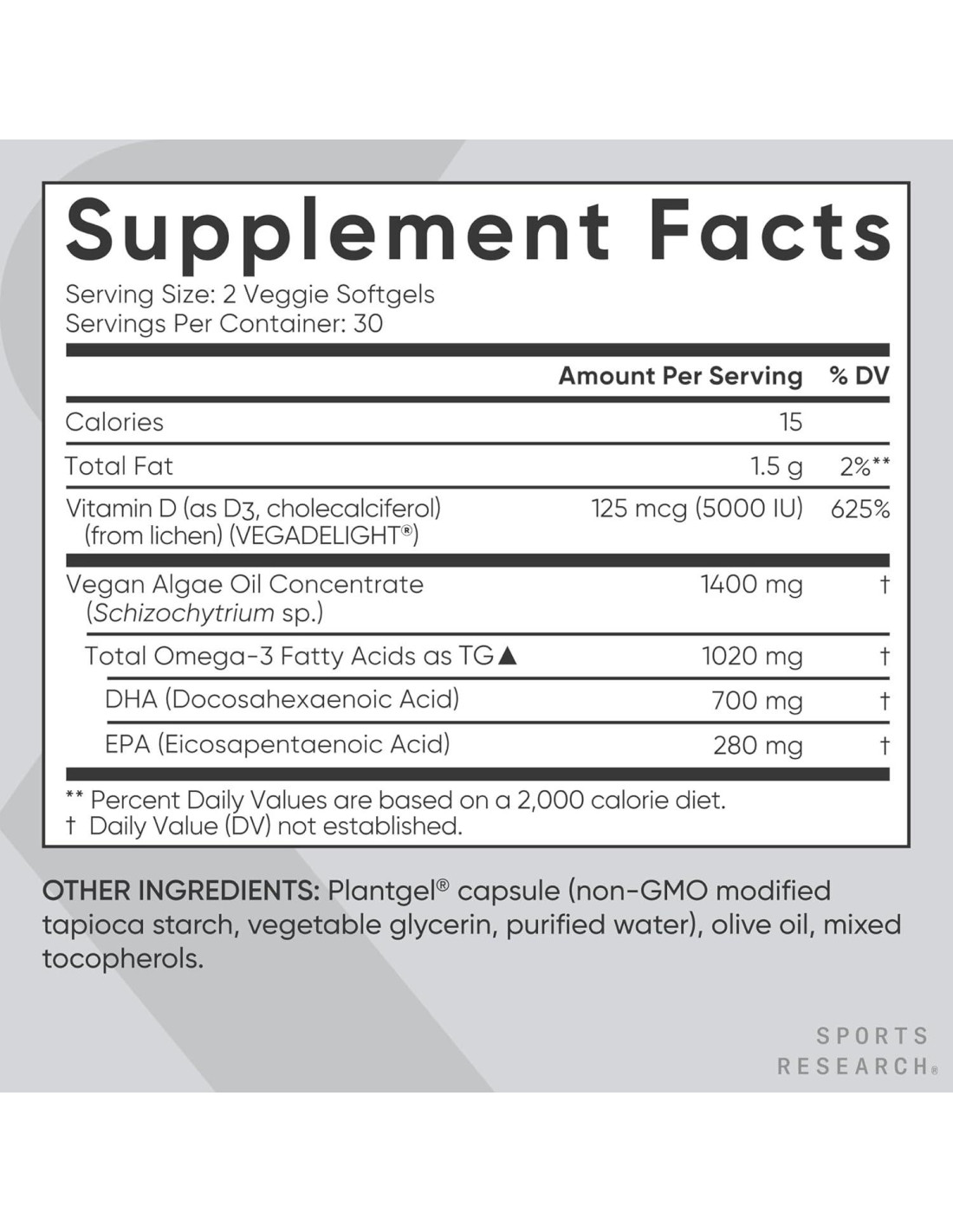 El Omega-3 Vegano de Sports Research va directamente a la fuente - aceite de algas - para ofrecer una porción completa de EPA y DHA a base de plantas sin sufrir ningún regusto a pescado o eructos. Nuestra fórmula contiene algas de origen sostenible con poco impacto en los ecosistemas marinos. Es el único Omega vegano en el mercado encapsulado en un softgel completamente vegano libre de carragenina. No busques más para recibir dos de las formas más importantes de Omega-3: EPA y DHA. Solo una porción de Omega-3 Vegano con D3 ofrece un valioso soporte para la salud ósea e inmune. En Sports Research, trabajamos arduamente para producir suplementos de un estándar más alto. Cada porción se entrega en una cápsula Plantgel libre de carragenina que es amigable con los veganos, libre de gluten y probada sin OGM. Omega Vegano + D3 Biotina de Alta Potencia CoQ10 Probióticos para Mujeres Vitamina K2 Hidratación de Electrolitos Fitoceramidas ¿Cómo previenes la contaminación cruzada con mariscos y otros alérgenos? Nuestros Omega-3 Veganos son libres de mariscos y seguimos estrictas pautas GMP para asegurar que no haya posible contaminación cruzada en nuestras instalaciones de fabricación. ¿De dónde se obtiene el D3? El D3 en nuestro Omega Vegano D3 se obtiene exclusivamente de líquenes. ¿Dónde puedo ver las pruebas de terceros? Puedes ver el Certificado de Análisis (COAs) de nuestros suplementos en nuestro sitio web utilizando la función 'Rastrear tu Lote'.