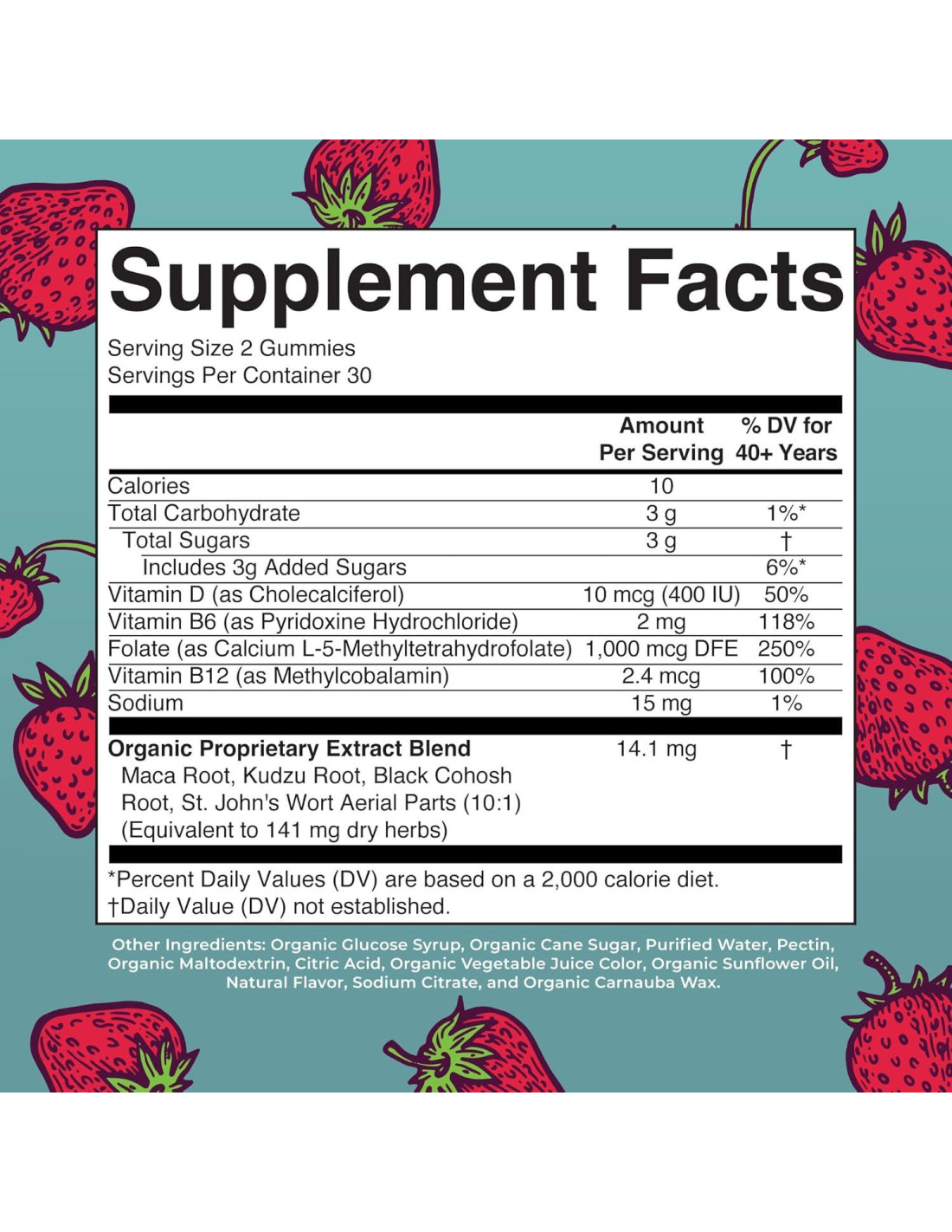 - Suplementos para la Menopausia para Mujeres: Apoya la salud menopáusica con estas deliciosas gomitas veganas formuladas para mujeres de 40 años en adelante. Encuentra alivio para los sofocos y soporte del estado de ánimo con hasta cuatro gomitas de sabor fresa al día.