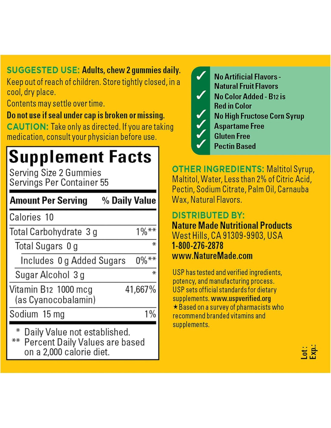 Las gominolas que amas ahora sin azúcar! Nature Made Gominolas de Vitamina B12 Energía Sin Azúcar proporcionan 1000 mcg de B12 por porción. B12 es una vitamina esencial que apoya la función de las células cerebrales, la producción de energía celular y ayuda a reducir la fatiga para aquellos con bajos niveles de Vitamina B12. Estas gominolas de Vitamina B12 1000 mcg por porción son a base de pectina, sin gluten y sin aspartame, sin sabores artificiales, sin jarabe de maíz alto en fructosa y sin color añadido - B12 es de color rojo. Lo mejor de todo, nuestras gominolas de Vitamina B12 sin azúcar no contienen azúcar y vienen en un delicioso sabor a frambuesa con otros sabores naturales. Adultos, mastique 2 gominolas al día. Comience su día con vitaminas B12 sin azúcar de Nature Made. USP ha probado y verificado ingredientes, potencia y proceso de fabricación. USP establece estándares oficiales para suplementos dietéticos. Visite el sitio web verificado por USP para más información. No es un alimento bajo en calorías. Ayuda a convertir los alimentos en energía celular. Basado en una encuesta de 2022 de farmacéuticos que recomiendan vitaminas y suplementos de marca. Estas declaraciones no han sido evaluadas por la Administración de Alimentos y Medicamentos. Este producto no está destinado a diagnosticar, tratar, curar o prevenir ninguna enfermedad.