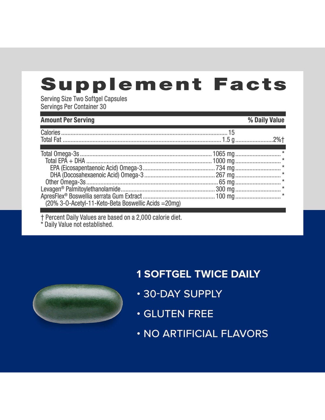 GNC Aceite de Pescado Triple Fuerza Plus Articulaciones proporciona los beneficios de los omega-3 más un soporte articular clínicamente probado y de acción rápida. Contiene ácidos grasos omega-3 de peces salvajes de aguas profundas, como salmón, atún, bacalao y anchoa. Los omega-3 también brindan apoyo para una visión saludable, desarrollo cerebral y salud de la piel. Nuestra fórmula presenta dos ingredientes premium para un soporte articular de acción rápida. AprésFlex es un potente extracto de Boswellia serrata, que está clínicamente probado para apoyar una mejora 7 veces mayor en la comodidad articular, así como mejoras en la rigidez y función articular, en tan solo 5 días. Las suaves cápsulas son convenientes y cuentan con un recubrimiento entérico que ayuda a controlar los eructos de pescado, para que puedas disfrutar del apoyo a la salud del aceite de pescado con menos olor. Además, este suplemento está purificado para reducir contaminantes como metales pesados, dioxinas y PCBs. Como suplemento dietético, toma una cápsula blanda dos veces al día con comida.