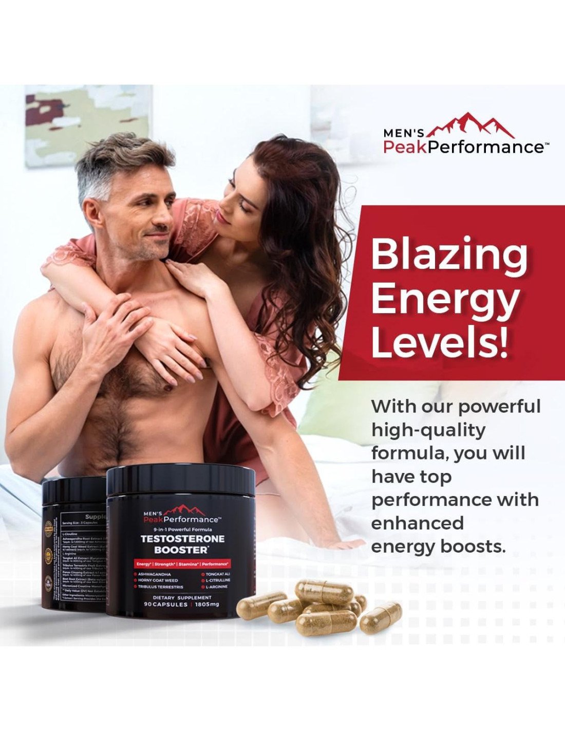 con el Aumentador de Testosterona MEN'S PeakPerformance. Especialmente formulado con 9 ingredientes premium y potentes - Hierba de Cabra, Ashwagandha, Tongkat Ali, L-Citrulina, L-Arginina, Tribulus Terrestris, Ginseng Panax, Raíz de Remolacha y Creatina Monohidratada Micronizada - nuestro suplemento aumentador de testosterona para hombres está diseñado para mejorar naturalmente. Apoya el crecimiento muscular magro, aumenta los niveles de testosterona libre y amplifica tu fuerza y rendimiento con cada dosis. Con nuestro suplemento aumentador de testosterona para hombres, diseñado para. Esta poderosa fórmula aumentadora de testosterona ayuda a tu cuerpo a optimizar el uso de energía al reducir la fatiga y aumentar la resistencia, permitiéndote superar tus límites y mantenerte activo por períodos más largos. Logra un rendimiento máximo y lleva tus entrenamientos al siguiente nivel. A medida que envejeces, con nuestro potente y eficaz suplemento aumentador de testosterona para hombres elaborado con 9 ingredientes naturales cuidadosamente seleccionados para mejorar el rendimiento. Restaura los niveles esenciales de testosterona para reavivar tu vitalidad, devolviendo la energía de tu juventud.
