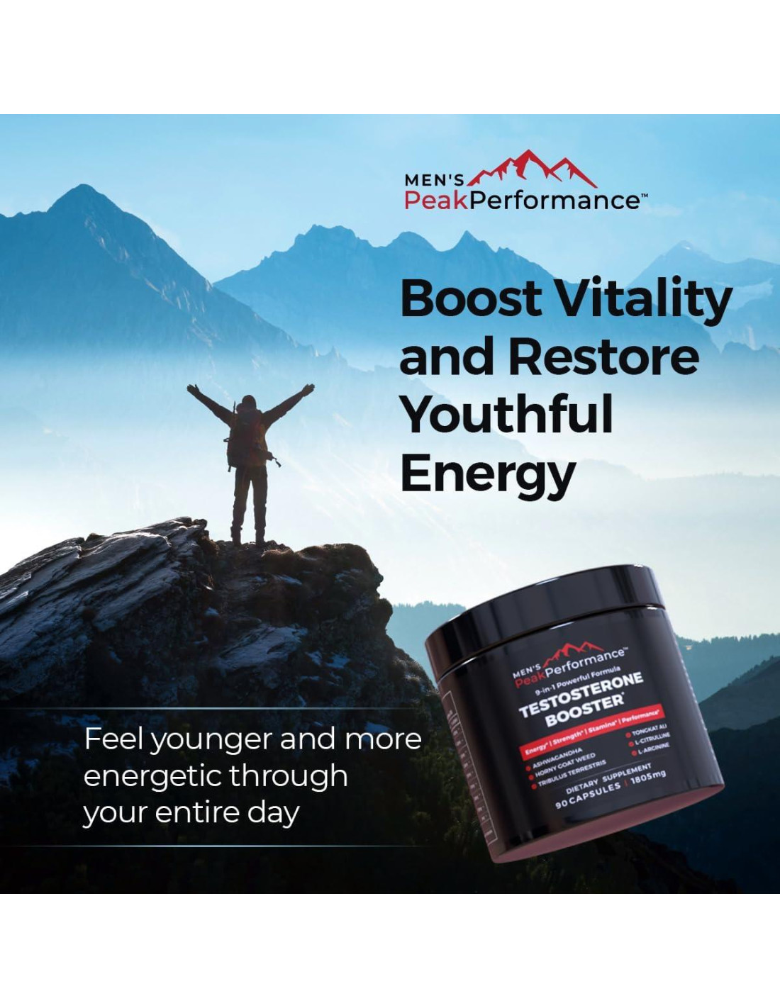 - RENDIMIENTO MÁXIMO: La testosterona es fundamental para alimentar la vitalidad y la fuerza física de los hombres. Para mejorar aún más tu rendimiento, el suplemento aumentador de testosterona MEN'S PeakPerformance está infusionado con extractos naturales respaldados científicamente como Extracto de Raíz de Ashwagandha, Extracto de Hierba de Cabra, L-Arginina, Extracto de Tongkat Ali, Extracto de Tribulus Terrestris, Extracto de Ginseng Panax y Extracto de Raíz de Remolacha fusionados en nuestra fórmula, lo que lo convierte en uno de los suplementos de vitalidad masculina más completos y de alto rendimiento.