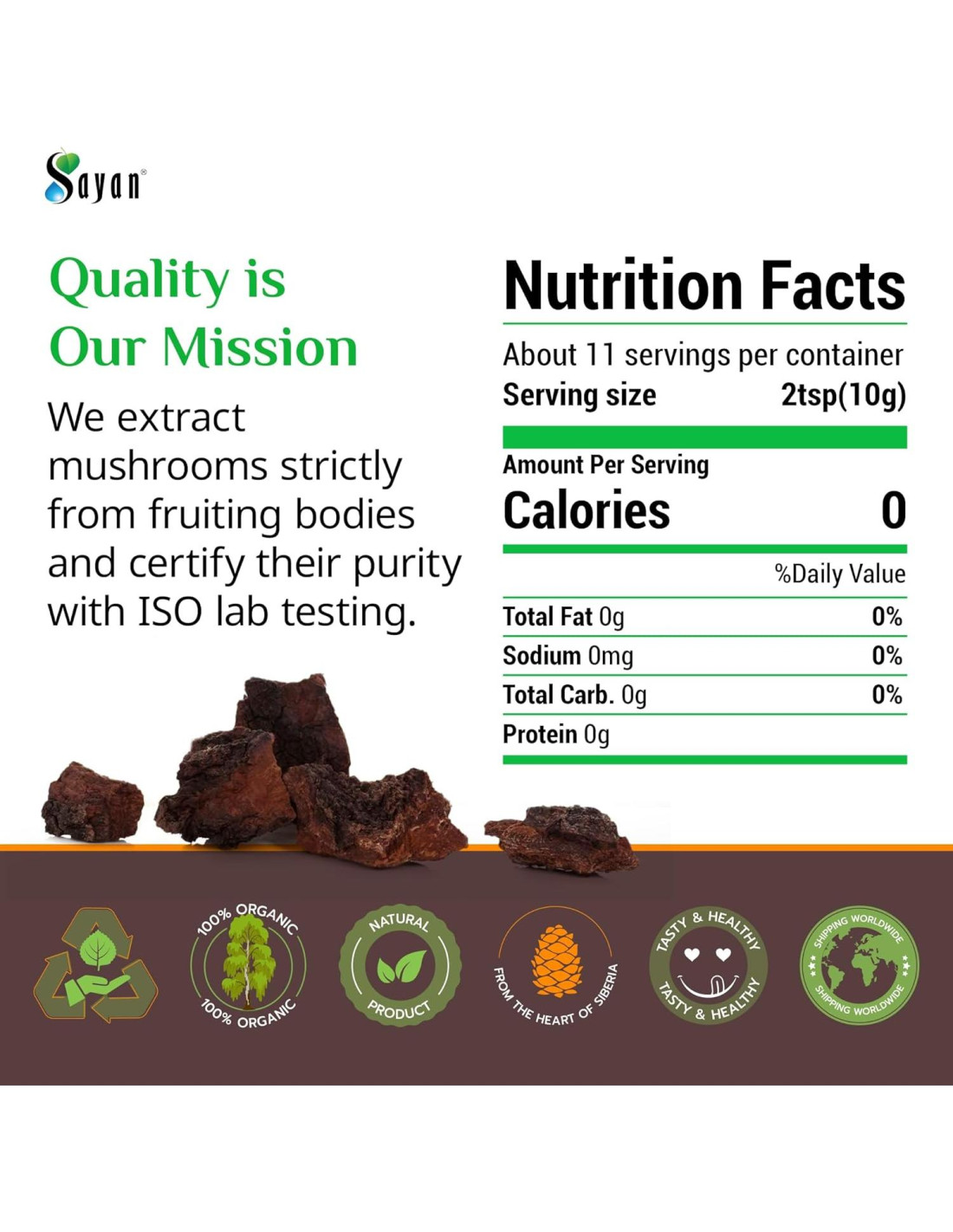 - Puro, Siempre Fresco y Sin OGM: Cosechado de manera sostenible, libre de conservantes y aditivos. Usamos un secador de grado farmacéutico y probamos cada lote por calidad con un medidor de humedad para que solo el mejor Chaga se ofrezca a usted.