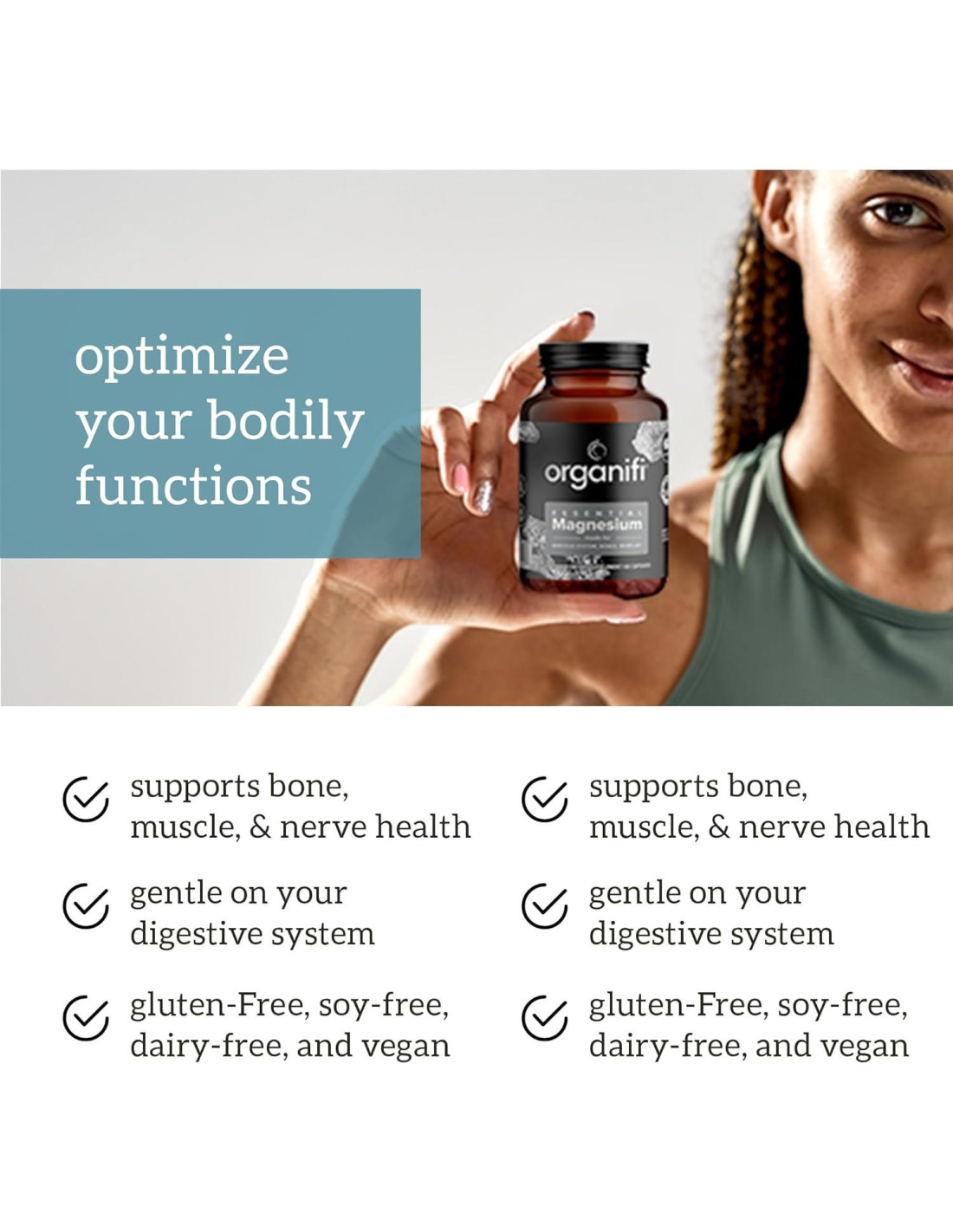 - Apoya la Salud Ósea y Muscular: El magnesio es el mineral definitivo para apoyar la función de tus huesos y músculos. El 70% del magnesio glicinato en nuestros cuerpos se almacena en los huesos, lo que significa que tomar una dosis diaria de magnesio apoya tu salud ósea general y ayuda a aumentar la resistencia ósea. El magnesio también actúa como un bloqueador natural de calcio, ayudando a que tus células musculares se relajen después de contraerse, permitiendo una mejor función muscular.