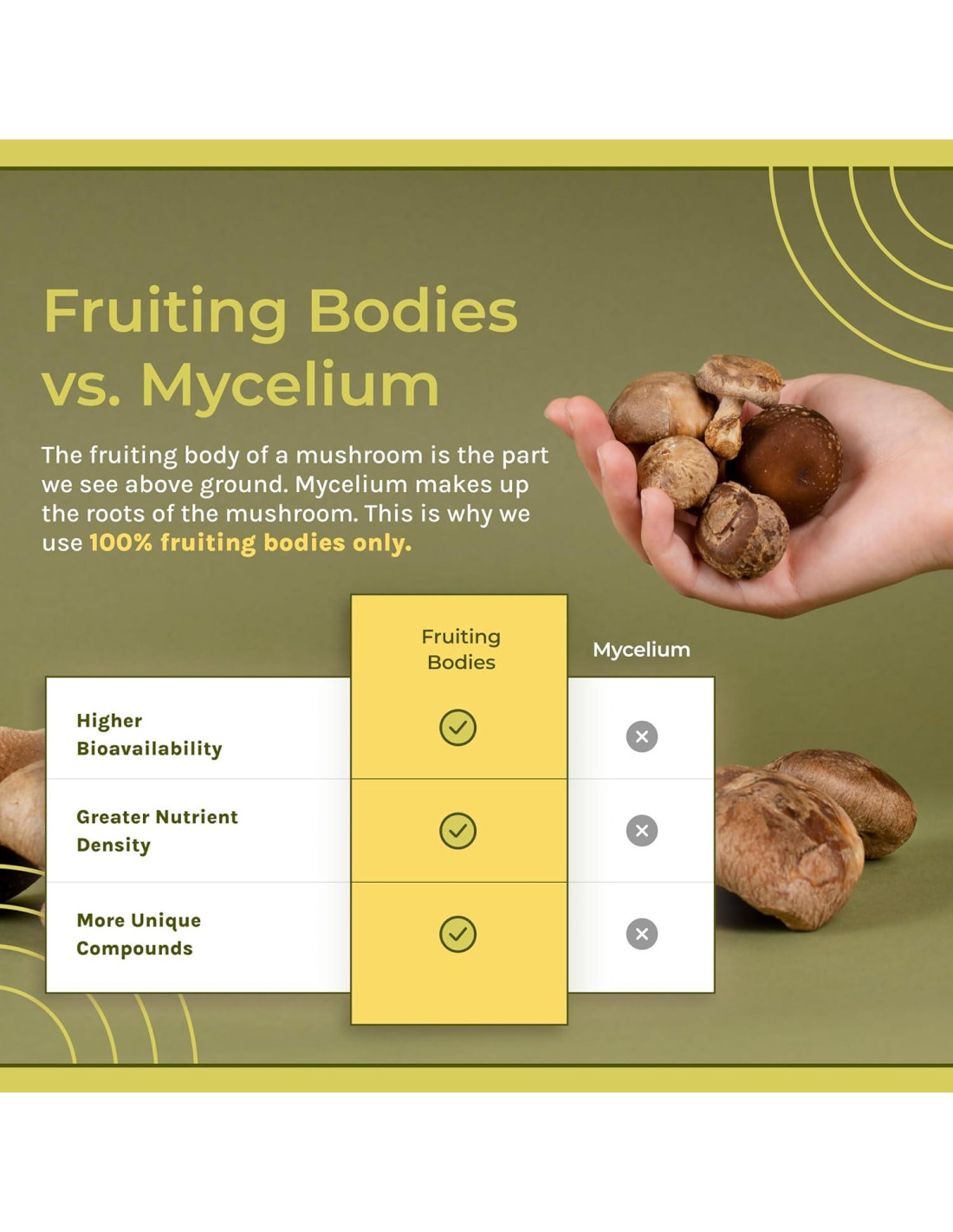 - INGREDIENTES NATURALES DE CALIDAD PREMIUM Polvo hecho de 100% cuerpos fructíferos, no micelio en grano - Sin rellenos, aditivos ni estimulantes - Fórmula certificada orgánica, apta para veganos y sin gluten - Probado en laboratorio por pureza y potencia.