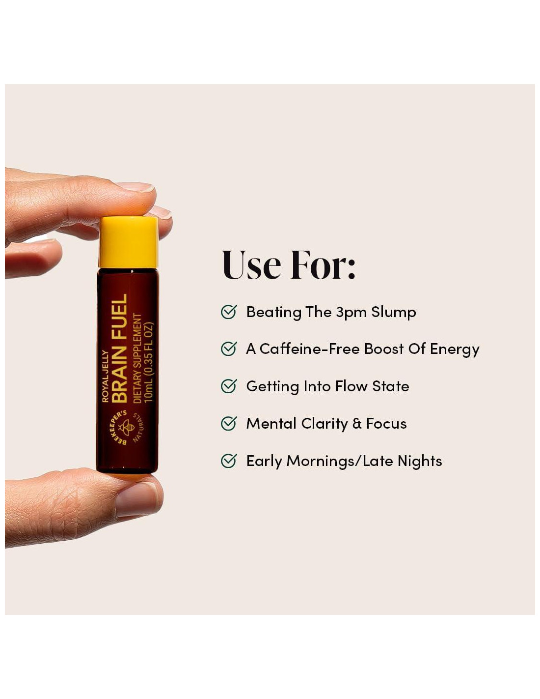 Hecho con Jalea Real y adaptógenos de origen vegetal, Ginkgo Biloba y Bacopa Monnieri para el apoyo cerebral. Enfoque mental y claridad sin nerviosismo ni caída. Colaboramos con la Instalación de Investigación de Abejas de UC Davis, para apoyar la protección de polinizadores. La Jalea Real ofrece nutrientes y antioxidantes que pueden apoyar el equilibrio hormonal y la salud cerebral. Gracias a compuestos beneficiosos raros, como 10-HDA, esta sustancia puede ayudar a mejorar la cognición y combatir la niebla cerebral. El Ginkgo puede apoyar el enfoque y la memoria con antioxidantes que pueden ayudar a aumentar el flujo sanguíneo al cerebro. Un elemento básico en la medicina ayurvédica, esta hierba puede ayudar a su cuerpo a manejar mejor los efectos del estrés. Formulamos productos poderosos en los que confía para el apoyo diario del sistema inmunológico, energía y cerebro. Probamos en terceros para asegurar que nuestros productos estén limpios. Estamos reinventando el botiquín creando productos limpios y efectivos para ayudarle a mantenerse bien. Descargo de responsabilidad de la FDA: Estas declaraciones no han sido evaluadas por la Administración de Alimentos y Medicamentos. Este producto no está destinado a diagnosticar, tratar, curar o prevenir ninguna enfermedad. Spray de garganta de propóleos. Spray de garganta de propóleos para niños. Salud intestinal completa. Polen de abeja. Miel superalimento. Spray nasal. Vitamina C liposomal.