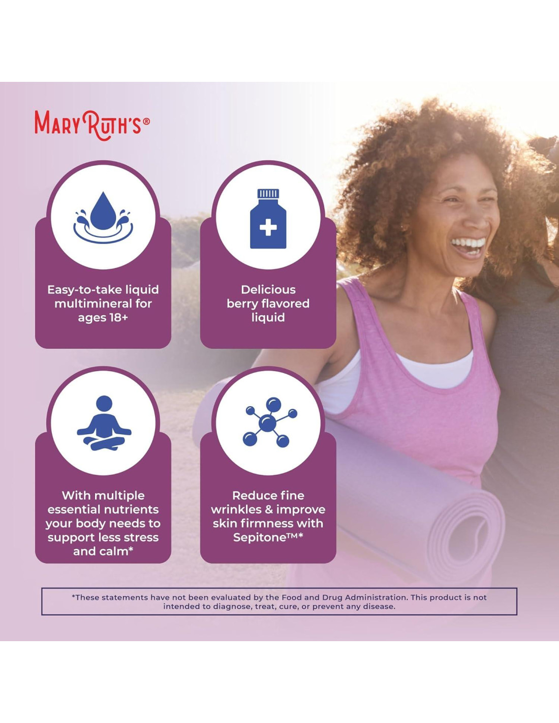 - Multimineral Mary Ruth: Al igual que nuestras fórmulas líquidas nocturnas originales, este multimineral contiene siete minerales - magnesio, calcio, zinc, selenio, cobre, manganeso y cromo - en una deliciosa y fácil de tomar fórmula líquida. Este líquido también contiene Sepitone, que está clínicamente demostrado en mujeres para aumentar la elasticidad de la piel, mejorar la firmeza y textura de la piel, y reducir arrugas finas con 30 días de uso continuo a 1 porción por día. Esta botella proporciona 15 porciones.