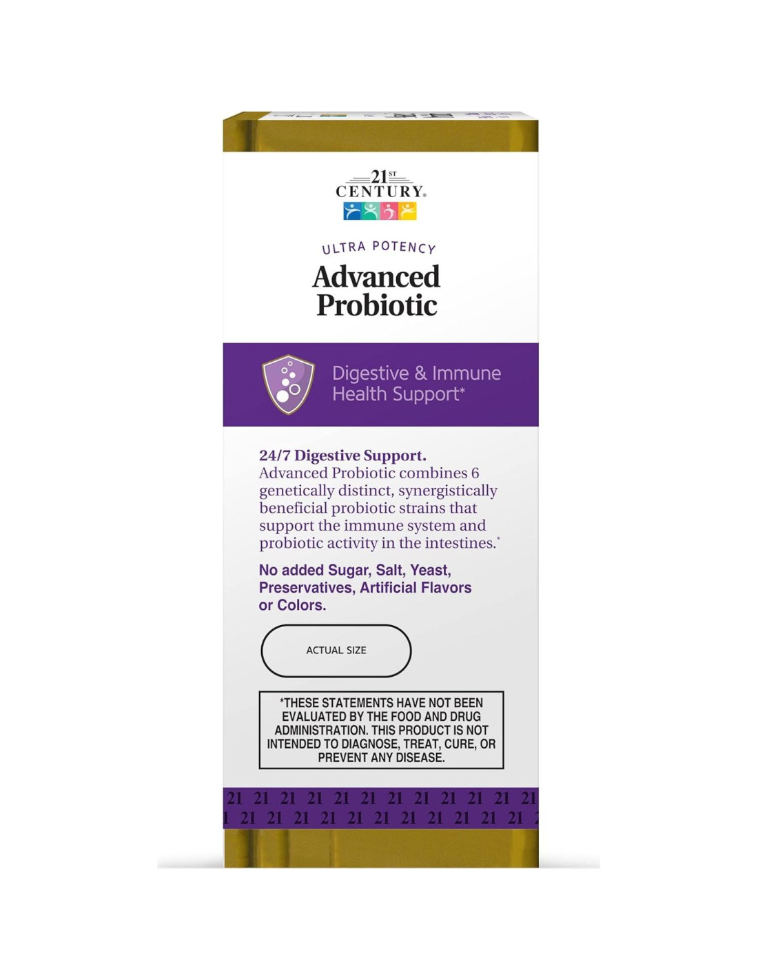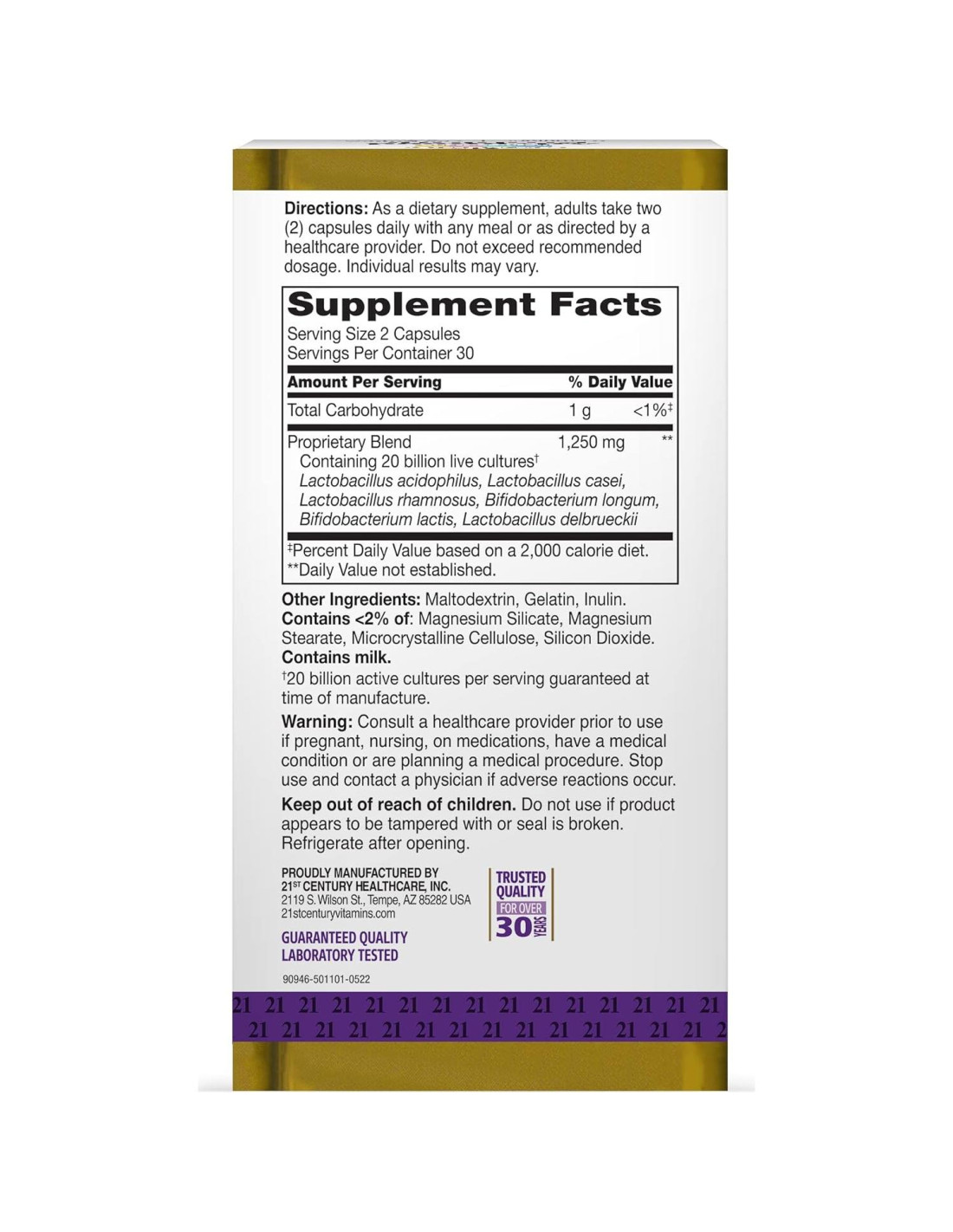6 Cepas Probioticas 20 Mil Millones - Cultivos Probioticos Vivos Fórmula de Balance Óptimo Suplemento Dietético Calidad Garantizada - Probado en Laboratorio Soporte Avanzado para: Digestión Flora Intestinal Función Inmunológica 20 mil millones por porción garantizados en el momento de la fabricación. Las Cápsulas Probioticas Avanzadas del Siglo 21 combinan sinérgicamente 6 cepas probióticas genéticamente distintas y beneficiosas y el prebiótico Inulina para apoyar la actividad probiótica en los intestinos. El Siglo 21 ofrece los ingredientes de la más alta calidad producidos bajo estrictos estándares para el apoyo de su buena salud.