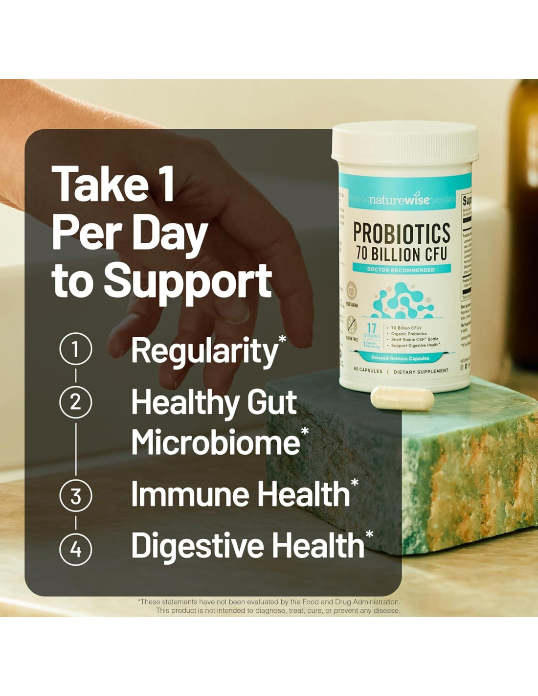 - PROBADO POR TERCEROS, CALIDAD ASEGURADA: NatureWise 70 Mil Millones CFU Probióticos son probados por terceros para pureza y eficacia y fabricados en EE. UU. con ingredientes de alta calidad de todo el mundo en una instalación certificada por cGMP.