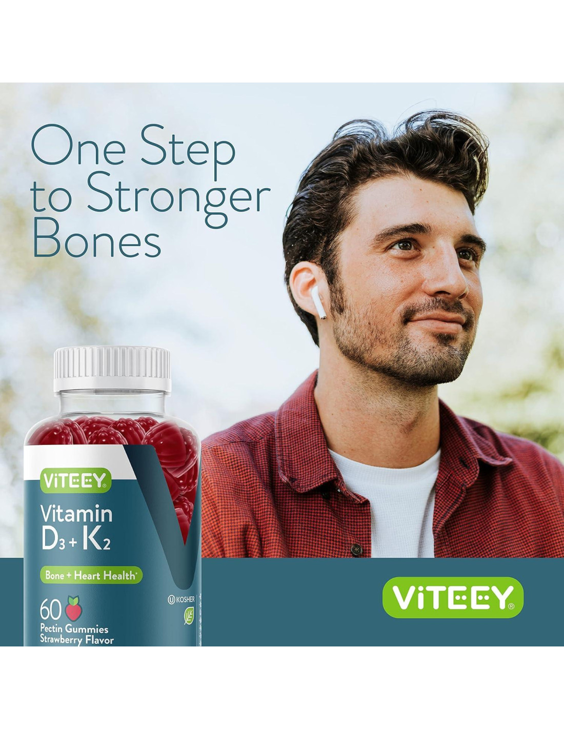 - SALUD ÓSEA + CARDIACA - Nuestro suplemento de vitamina K2 D3 ofrece la combinación perfecta para ayudar a fortalecer huesos y músculos, aumentar naturalmente la inmunidad y mejorar el estado de ánimo general. Los ingredientes de las gomas de vitamina D3 + K2 de Viteey están perfectamente formulados y combinados para adultos y adolescentes. Fácil y conveniente de tomar en casa o en movimiento.