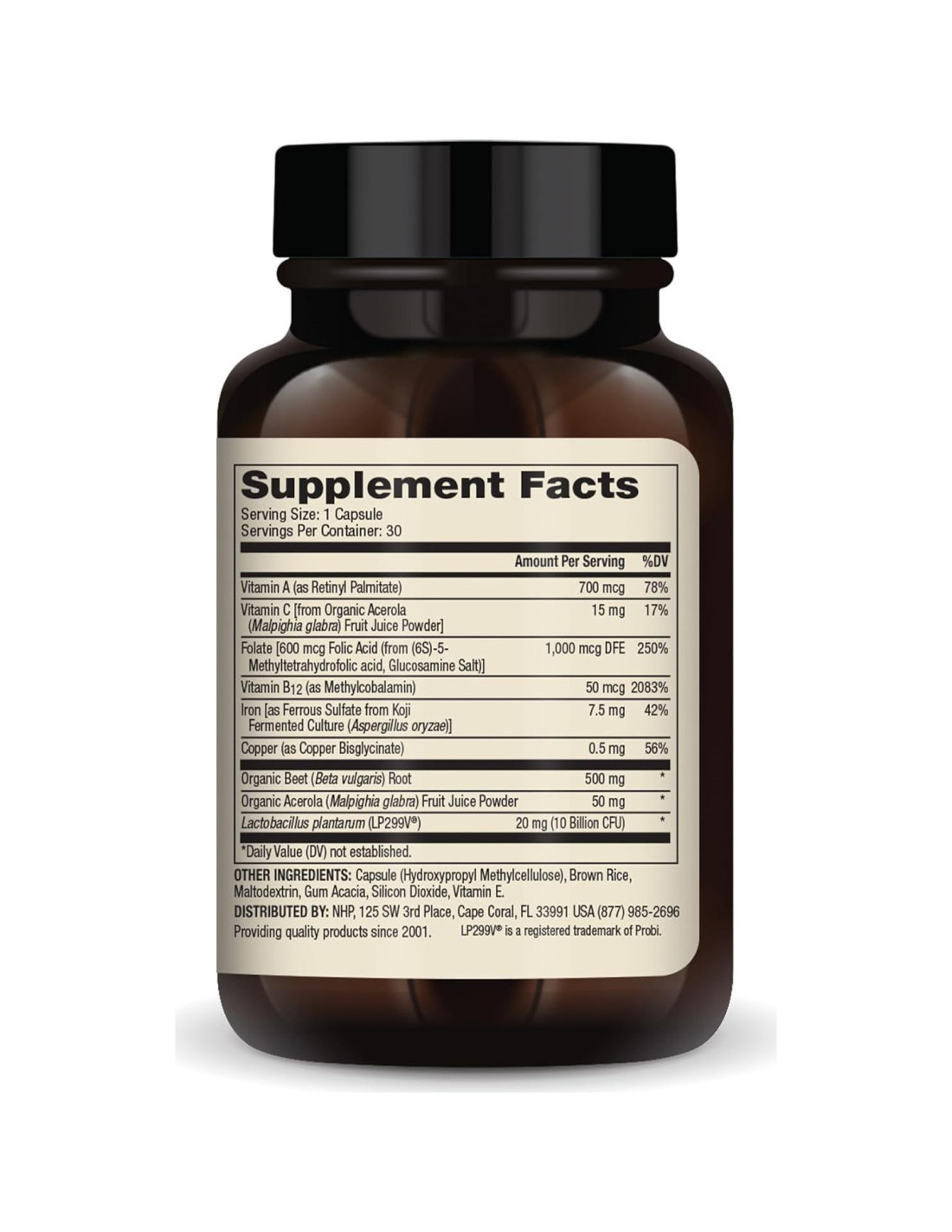 - También incluye alimentos reales, como Raíz de Remolacha Orgánica y Jugo de Fruta de Acerola Orgánica con Vitamina C, además de nutrientes de apoyo, como Vitamina A, Folato, Vitamina B12 como Metilcobalamina y Cobre para ayudar a combatir la fatiga y apoyar la producción de glóbulos sanguíneos.