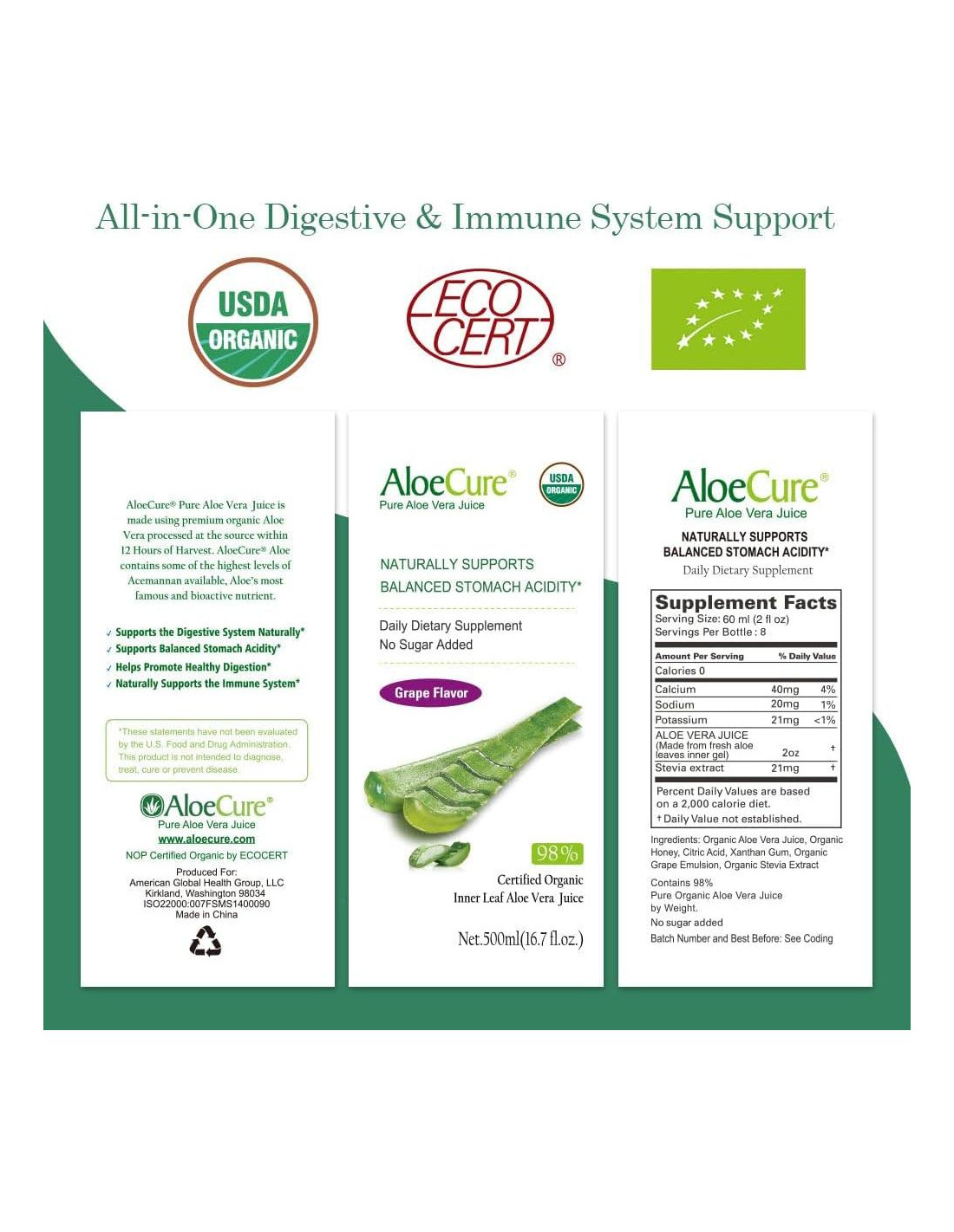 - Armonía Digestiva y Vitalidad: Alimente su cuerpo con los nutrientes vitales que se encuentran en nuestro Jugo de Aloe Vera Orgánico, aumentando su bienestar y vitalidad general mientras combate la acidez estomacal elevada. El jugo de aloe vera orgánico de AloeCure para beber es 98.7 por ciento gel interno de aloe vera que nunca se hace de concentrado + extracto de uva orgánico.