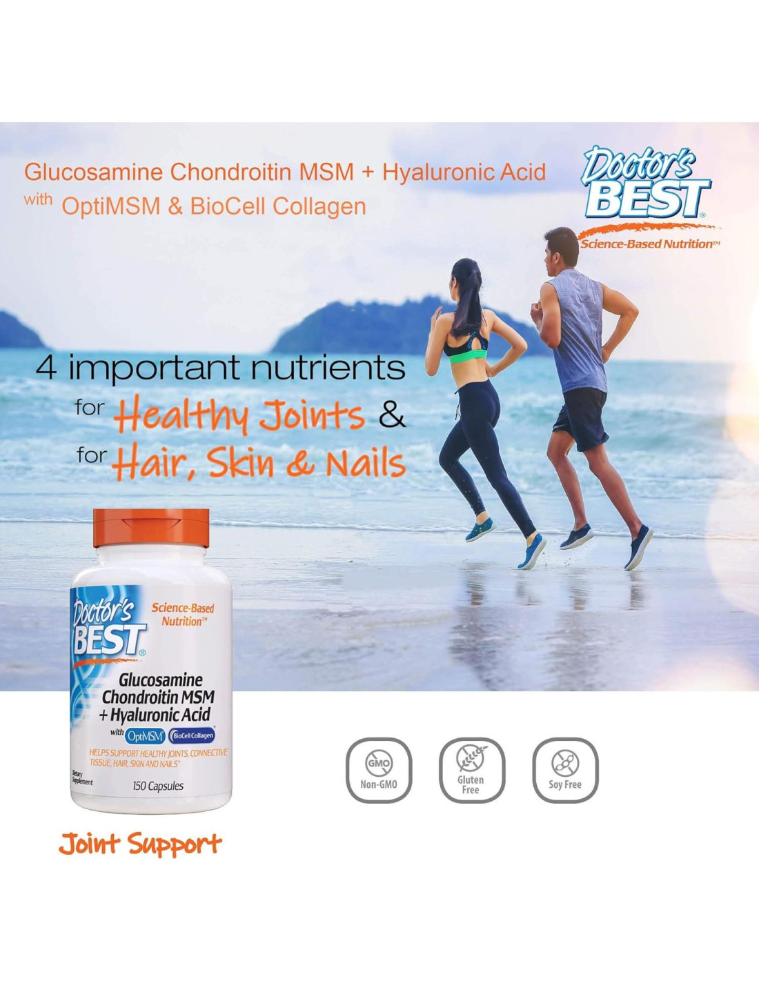 La Glucosamina Condroitina MSM + Ácido Hialurónico de Doctor's Best proporciona cuatro nutrientes importantes que ayudan a mantener articulaciones saludables: Glucosamina, Condroitina, metilsulfonilmetano (MSM, de óptimo) y ácido hialurónico (de colágeno Biocell).* El sulfato de glucosamina ayuda a promover la lubricación articular para un mejor movimiento y flexibilidad de las articulaciones.* El MSM proporciona azufre biodisponible necesario para la salud articular. El colágeno Biocell es un ingrediente dietético probado que contiene una composición patentada de colágeno hidrolizado tipo II, sulfato de condroitina y ácido hialurónico en una matriz altamente absorbible.*
