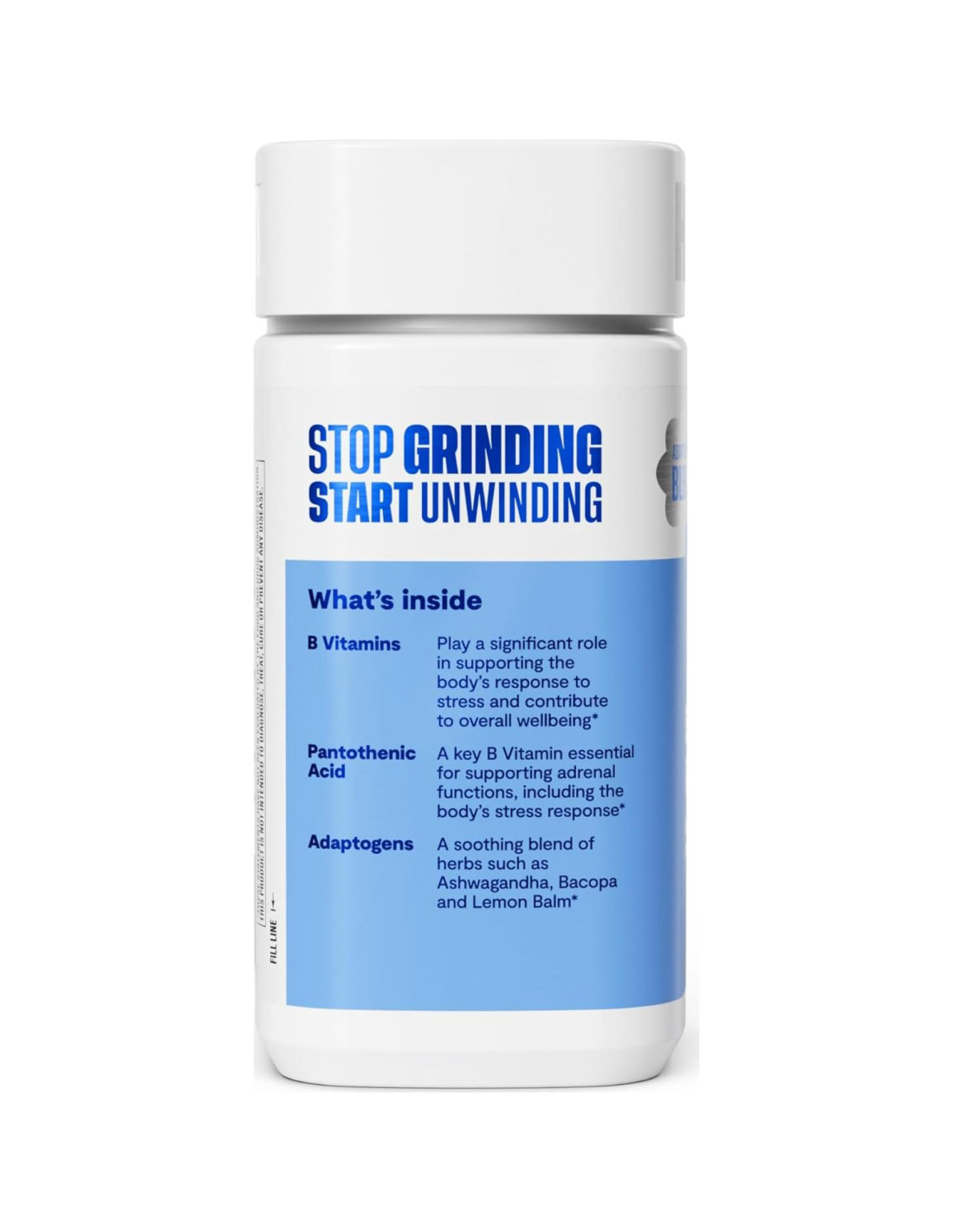- QUÉ HAY DENTRO: Una mezcla para reducir el estrés de Vitamina B1, Vitamina B2, Niacinamida y Ácido Pantoténico, además de adaptógenos Ashwagandha, Bacopa y Melisa.