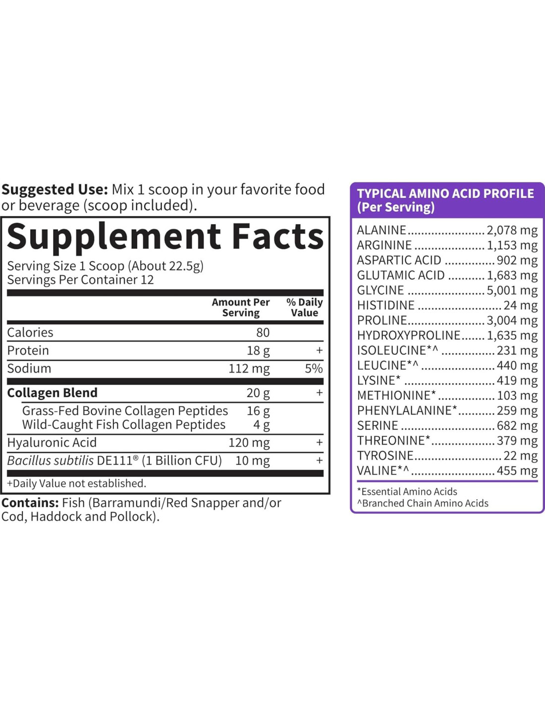 Obtén todo lo que tu rutina de belleza necesita en solo una cucharada de nuestro colágeno de múltiples fuentes y ácido hialurónico que proporciona 20g de fuentes premium de colágeno obtenidas de colágeno de bovino alimentado con pasto y marino capturado en la naturaleza, además de 1 mil millones de UFC de probiótico Bacillus subtilis DE111 clínicamente estudiado. No tiene sabor, no tiene olor y se mezcla bien con cualquier comida o bebida, lo que lo convierte en la adición perfecta a un batido de proteínas, café caliente o frío, batidos o repostería. Verdaderamente un colágeno con infinitas cantidades de beneficios así como usos que te motivarán a dejar fluir tu creatividad. Nuestro colágeno de múltiples fuentes con ácido hialurónico también no contiene hormonas ni antibióticos añadidos y está hecho sin ingredientes lácteos o de soya, azúcares añadidos, rellenos, colores artificiales, sabores, edulcorantes o conservantes. Colágeno hidrolizado - altamente absorbible. Estas declaraciones no han sido evaluadas por la Administración de Alimentos y Medicamentos. Este producto no está destinado a diagnosticar, tratar, curar o prevenir ninguna enfermedad.