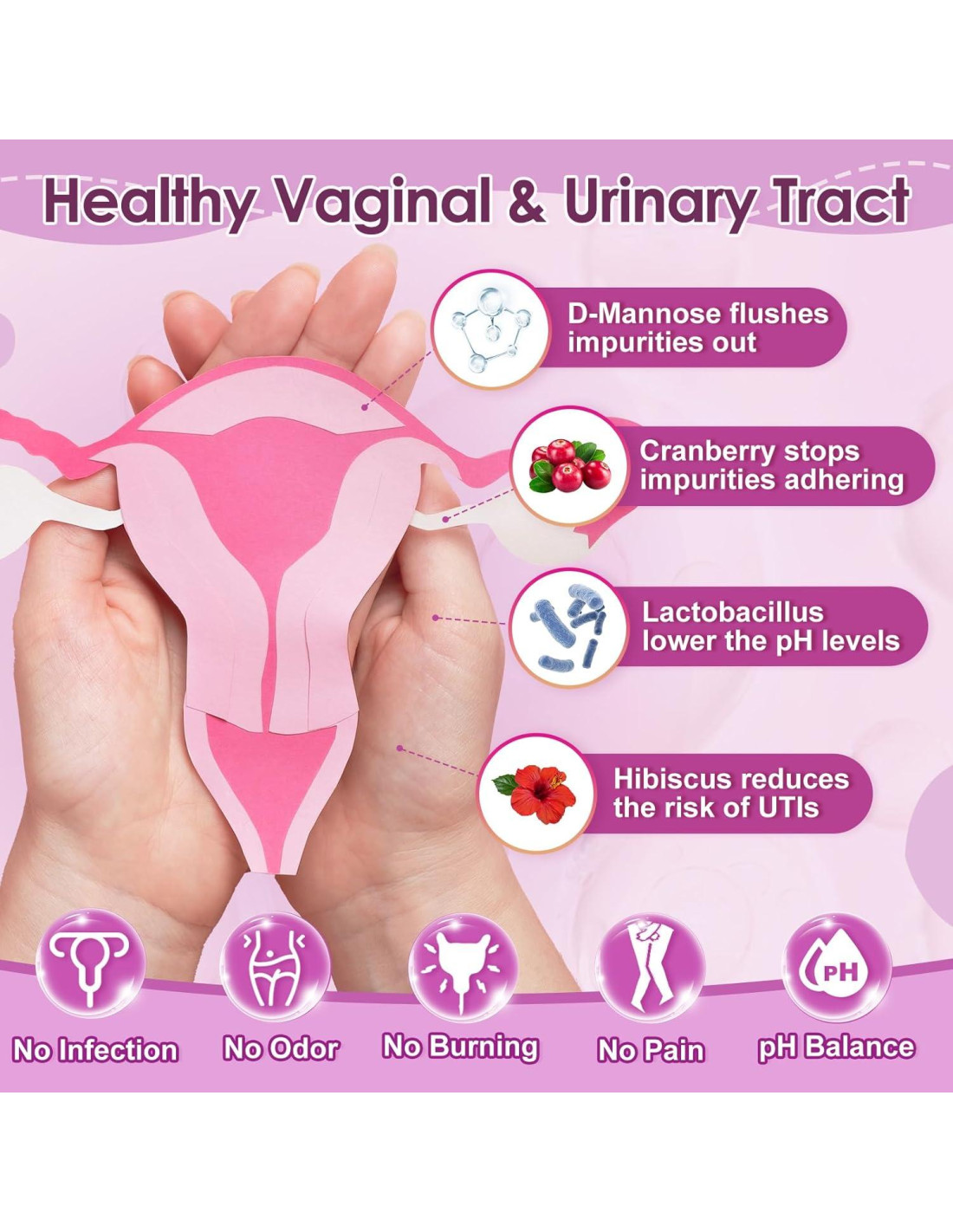 - Mantener la Salud Vaginal y del Tracto Urinario: La D-mannosa atrapa impurezas y desintoxica, el arándano detiene la adherencia de flora dañina, el hibisco y el diente de león aumentan el flujo para eliminar, probióticos para el equilibrio de pH. La acción de cinco vías funciona rápidamente para aliviar ardor, picazón y olores. Una formulación superior restaura el equilibrio y la limpieza adecuados en el área íntima de las mujeres. Sin azúcar, calorías ni conservantes que son seguros para tomar a diario para mejorar el bienestar.