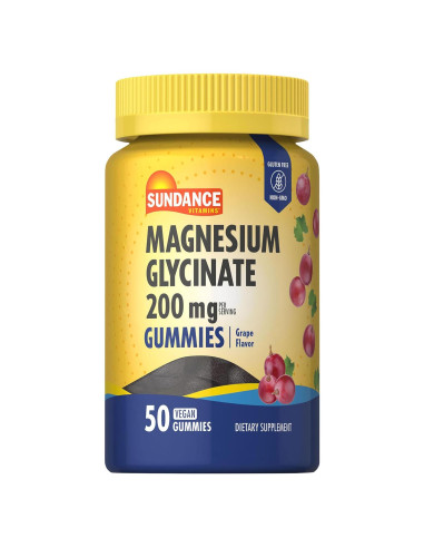 Las Gomitas de Magnesio Glicinato son una forma absorbible de magnesio, un mineral esencial que el cuerpo necesita pero no puede producir por sí mismo. Aunque el magnesio se puede obtener a través de alimentos como granos enteros y verduras de hoja verde, un suplemento de alta calidad puede ayudar a satisfacer su requerimiento diario para este mineral importante. Cada porción de nuestras Gomitas de Magnesio Glicinato proporciona 22 mg de este mineral importante, a partir de 200 mg de Magnesio Glicinato. Estas gomitas veganas para hombres y mujeres tienen un delicioso sabor a uva y son muy fáciles de tomar. Vitaminas Sundance: Deja que tu salud brille. Agrega un poco de sol a tu día con vitaminas y suplementos de alta calidad de Sundance. Con suplementos a precios asequibles disponibles en varias formas de entrega como cápsulas, geles blandos, masticables, tabletas, líquidos y gomitas, hay una opción para todos. Nuestro Magnesio Glicinato es vegano, no OGM y libre de gluten, trigo, levadura, leche, lactosa, soja y edulcorantes artificiales.