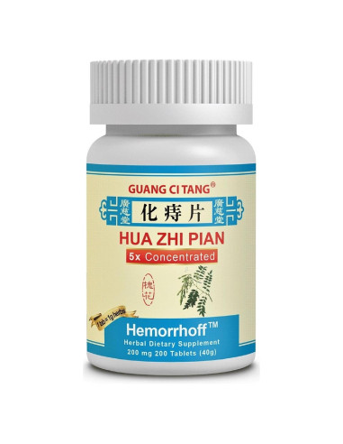 ActiveHerb Guang Ci Tang Hua Zhi Pian (Hemorrhoff) 200 mg 200 Tabletas por botella. Las hierbas en Hemorrhoff están concentradas a una fuerza de 5:1. Con una verdadera concentración de 5:1, este producto representa la forma más potente de Hua Zhi Pian en el mercado. Una tableta es igual a 1 gramo de hierba cruda. La Medicina Tradicional China o MTC utiliza estas hierbas para abordar las quejas relacionadas con las hemorroides. Las tabletas de Hua Zhi Pian están hechas con 100 por ciento de hierbas naturales que son probadas por autenticidad, calidad y potencia.