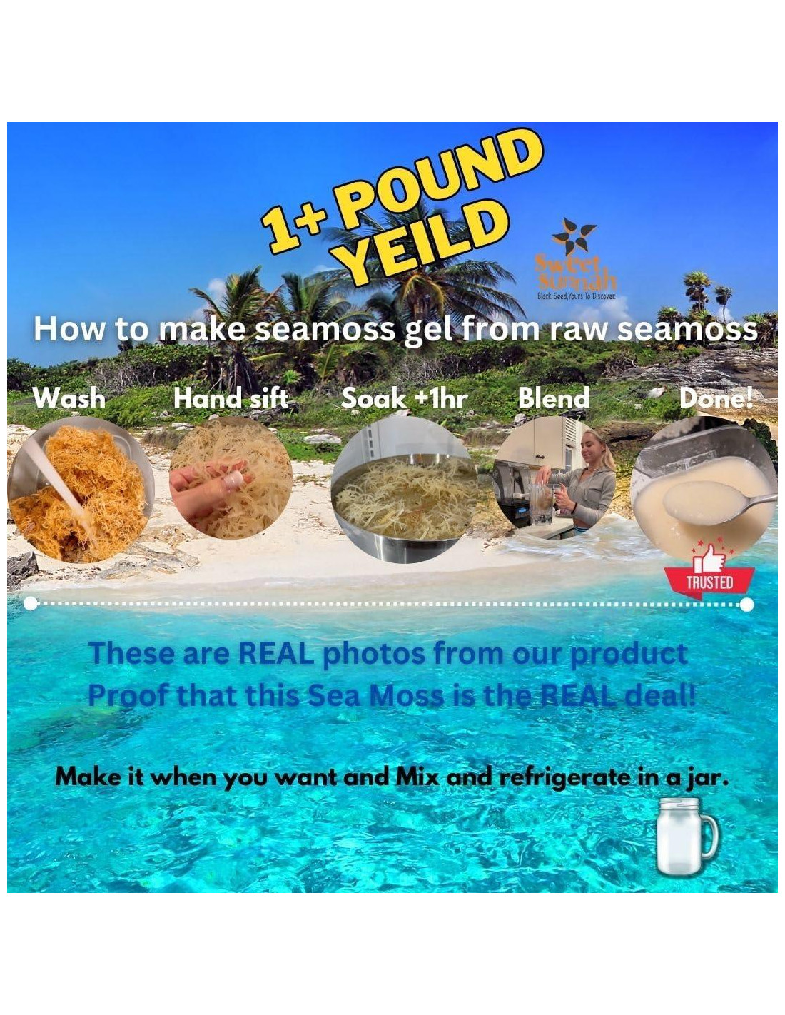 - Máximo Rinde solo mira las imágenes, Mínimo Esfuerzo: Con nuestro Gel de Musgo Marino de 1 lb + Rinde, crear tu propio gel de musgo marino nunca ha sido tan fácil. Solo sigue nuestras simples instrucciones, mezcla el musgo marino secado al sol con agua y observa cómo se transforma en un gel espeso y delicioso que puedes disfrutar de diversas maneras.
