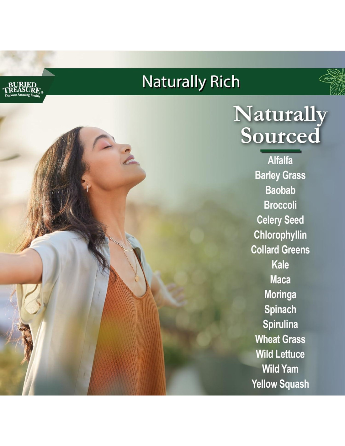 - Mezcla de Superalimentos para una Salud Óptima: Buried Treasure Green20 Fusion combina una mezcla potente de superalimentos densos en nutrientes como espirulina, chlorella y pasto de trigo, proporcionando 32 porciones de verduras diarias para apoyar el bienestar general.