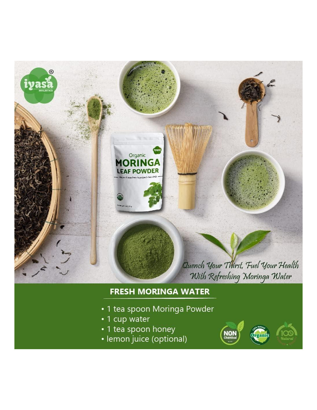 - Polvo de Hoja de Moringa Orgánica Iyasa se obtiene de una región fértil de India. Es vegetariano, vegano; libre de gluten, soja, trigo y maíz.