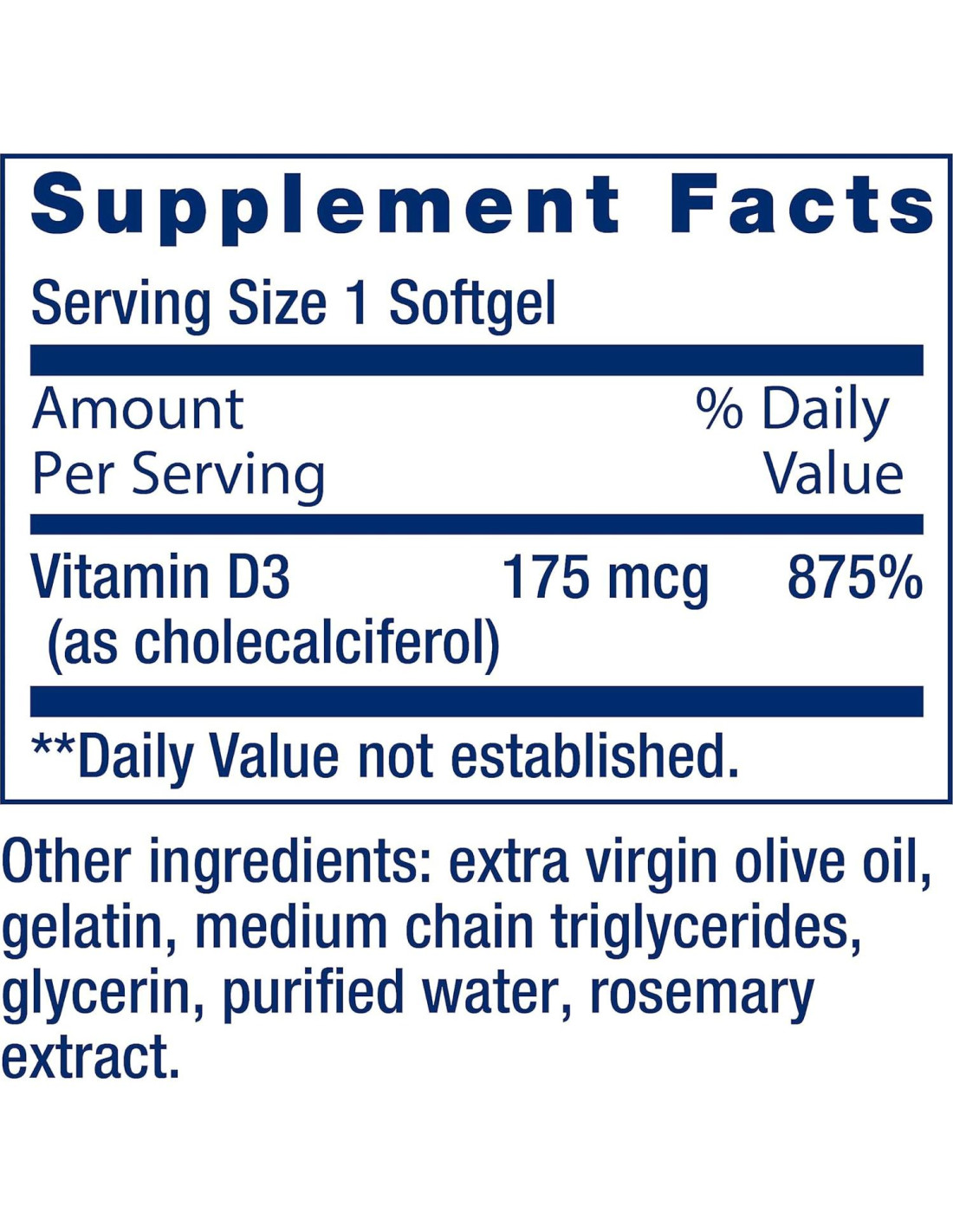 - Vitamina "D" para la salud de todo el cuerpo: tu cuerpo utiliza la vitamina D para mantenerte saludable y prosperar. Y aunque tu piel produce vitamina D cuando está expuesta a la luz solar, no debería ser tu única fuente. Este suplemento de vitamina D de alta potencia proporciona 175 mcg de colecalciferol (vitamina D3), una forma de vitamina D que es más eficiente para mantener niveles saludables de esta vitamina esencial.