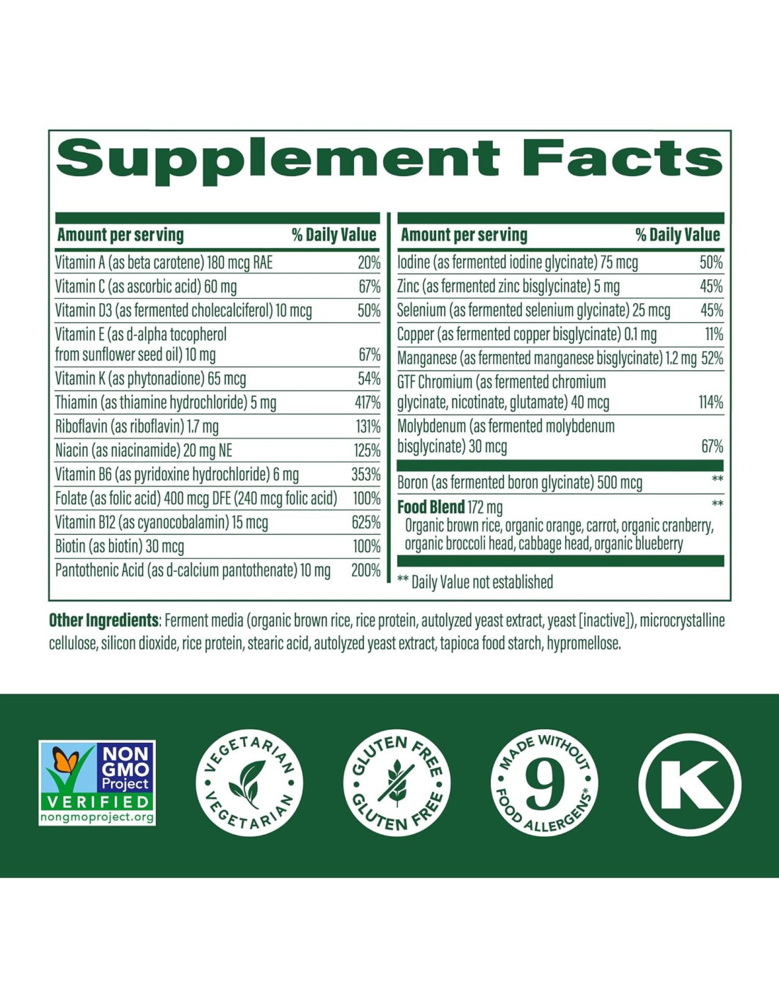 - Todas nuestras multivitaminas están hechas con vitaminas emparejadas con alimentos y minerales fermentados, y se pueden tomar en cualquier momento del día, incluso con el estómago vacío. 1 tableta diaria