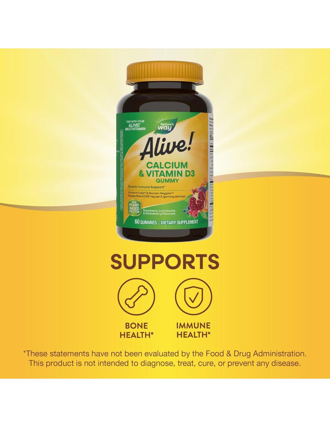 - Las gomitas de Calcio y D3 de Nature's Way Premium apoyan huesos saludables, dientes fuertes, función muscular y salud inmunológica.* Tómalo con tu multivitamínico para apoyar múltiples sistemas del cuerpo.*
