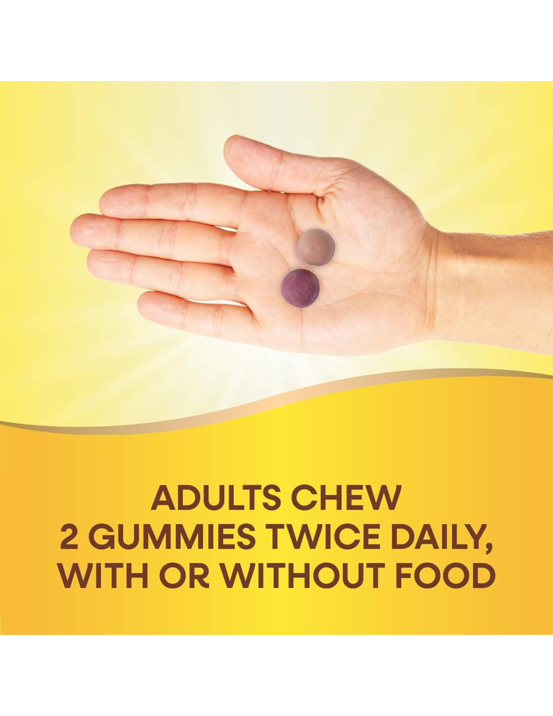- Los adultos mastican 2 gomitas dos veces al día con o sin comida.